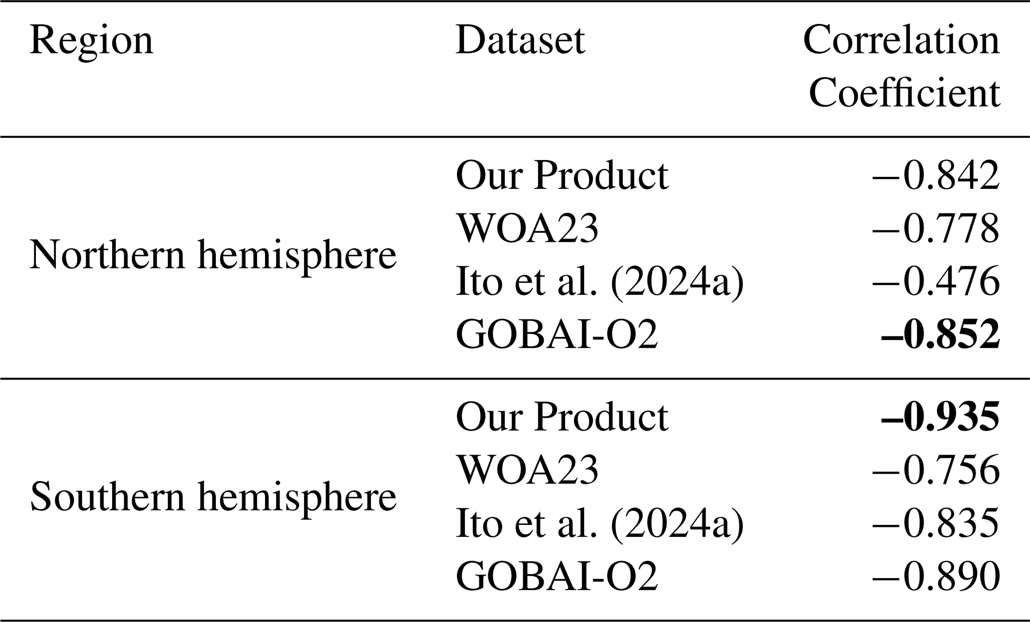We also compare the climatological seasonal cycle of oxygen in our product across both hemispheres with that from WOA23, as well as with the GOBAI-O2 product (Sharp et al., 2022) and the Ito et al. (2024a) product (Fig. 7). Overall, the seasonal oxygen cycle in our product closely aligns with WOA23 and previous ML-based estimates. As expected, Fig. 7 shows that oxygen seasonality is more pronounced in the upper ocean, reflecting the strong seasonal variability in oxygen saturation, which is primarly driven by temperature variations. This relationship is further quantified by the Pearson correlation coefficients between dissolved oxygen and temperature anomalies reported in Table 1.