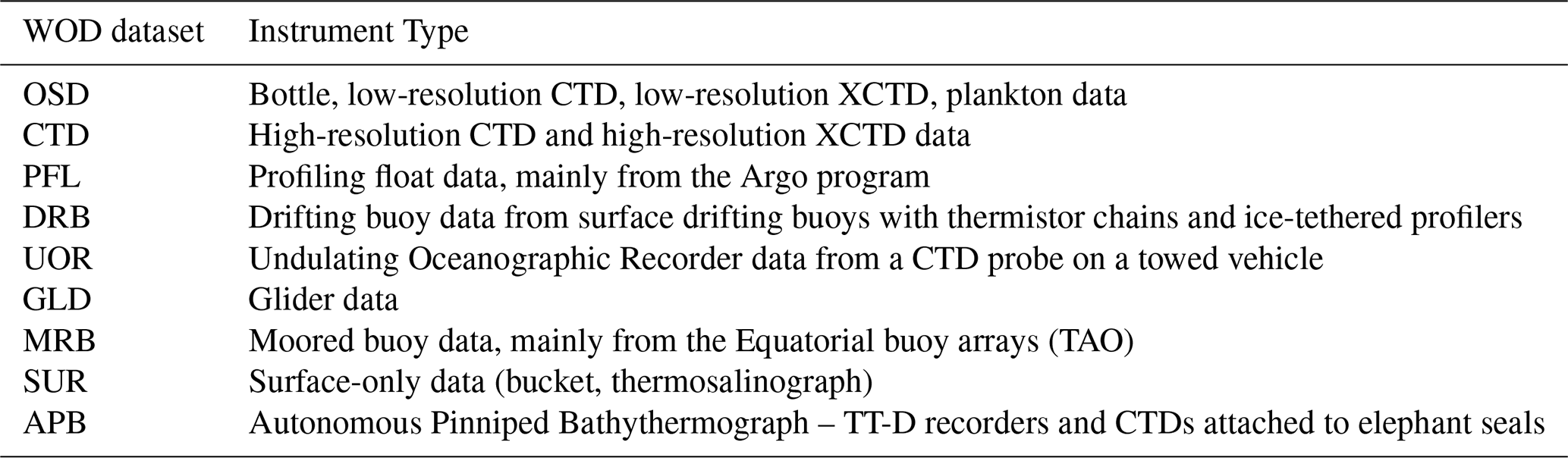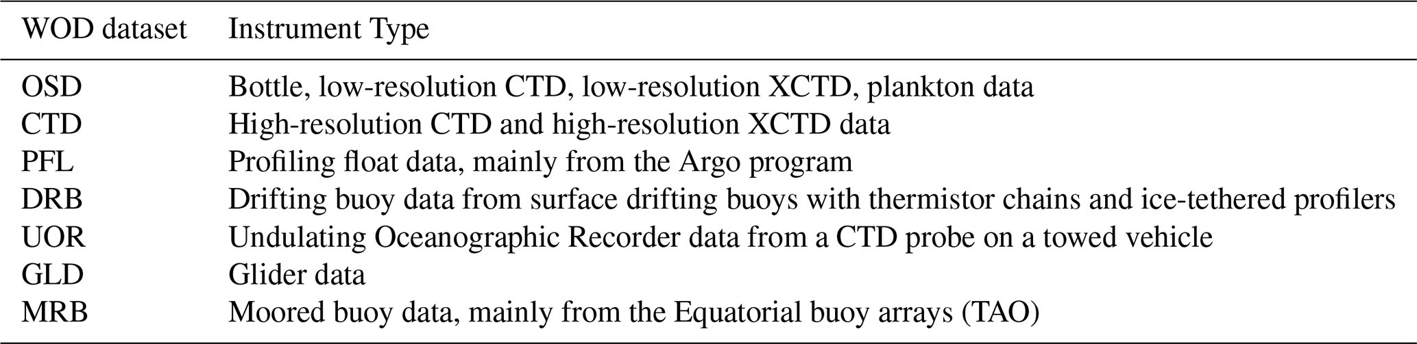 This section outlines the data sources used in this study. The data are organized into two distinct databases. The first database, presented in Table C1, includes data sources and instruments that provide collocated measurements of temperature, salinity, and dissolved oxygen. This dataset is utilized for training, validation, and testing of the neural network emulator. Oxygen data from this dataset are also used in the optimal interpolation.