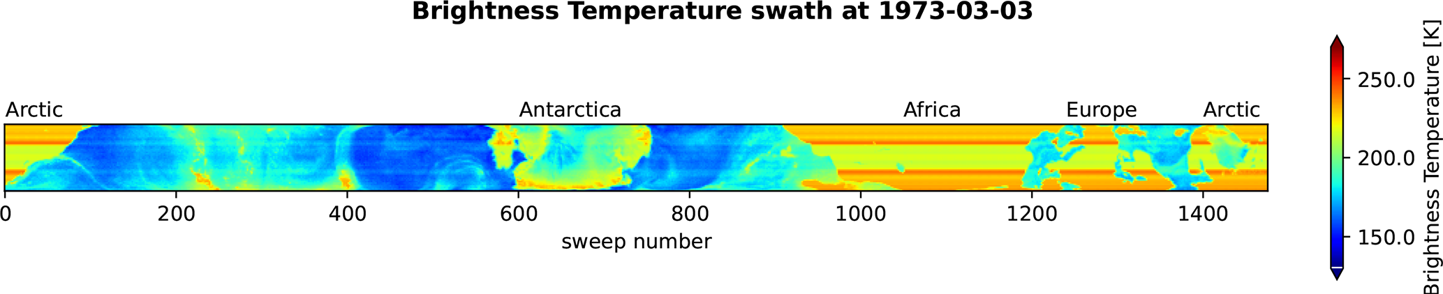 Figure 1Example of the types of swaths the swath filter is meant to detect. In this swath, TB over land and ice is constant along track, as the true TB is above 220 K.