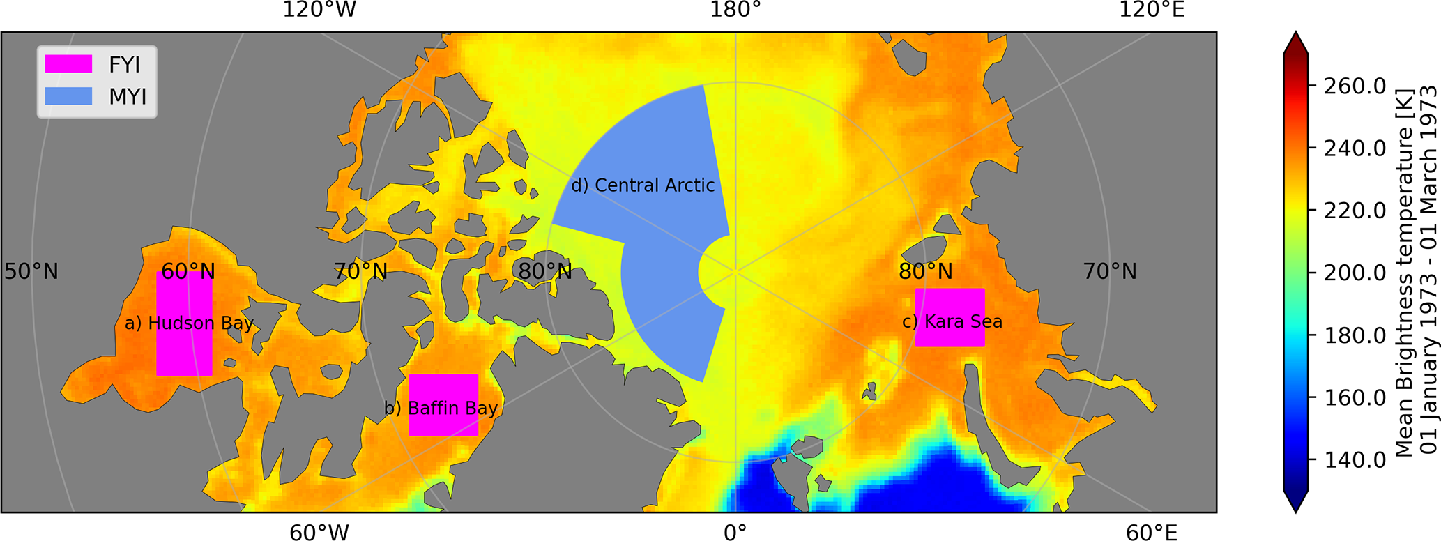To select the parameters rSDmax, N, , and , we analyzed Arctic areas representing radiometrically distinct types FYI and MYI during the period 1 January 1973–1 March 1973. The manually selected areas are shown in Fig. 3. We avoided latitudes above 88° N, as the data here are derived entirely from scan positions with an incidence angle greater than 50.1° (from where incidence angles increase by more than 1° per scan position).