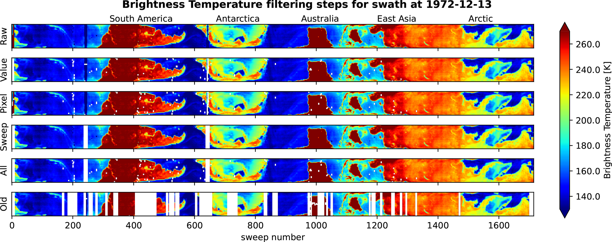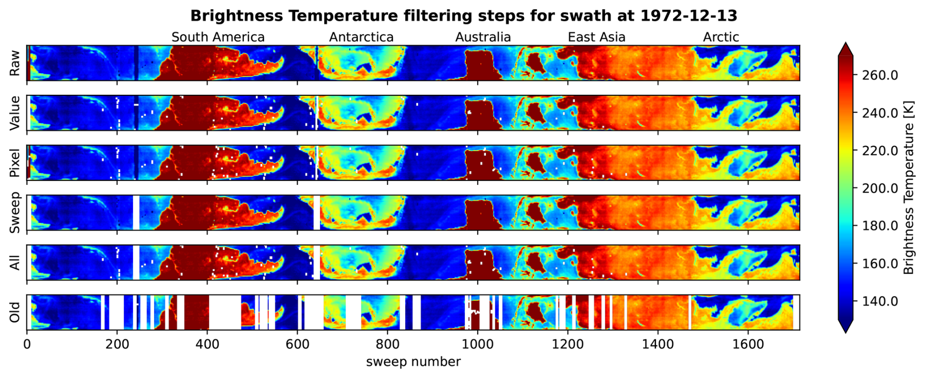 Figure 5Display of new filters applied individually and together on a select swath (from 13 December 1972), along with the result from applying the old scheme to the same swath.