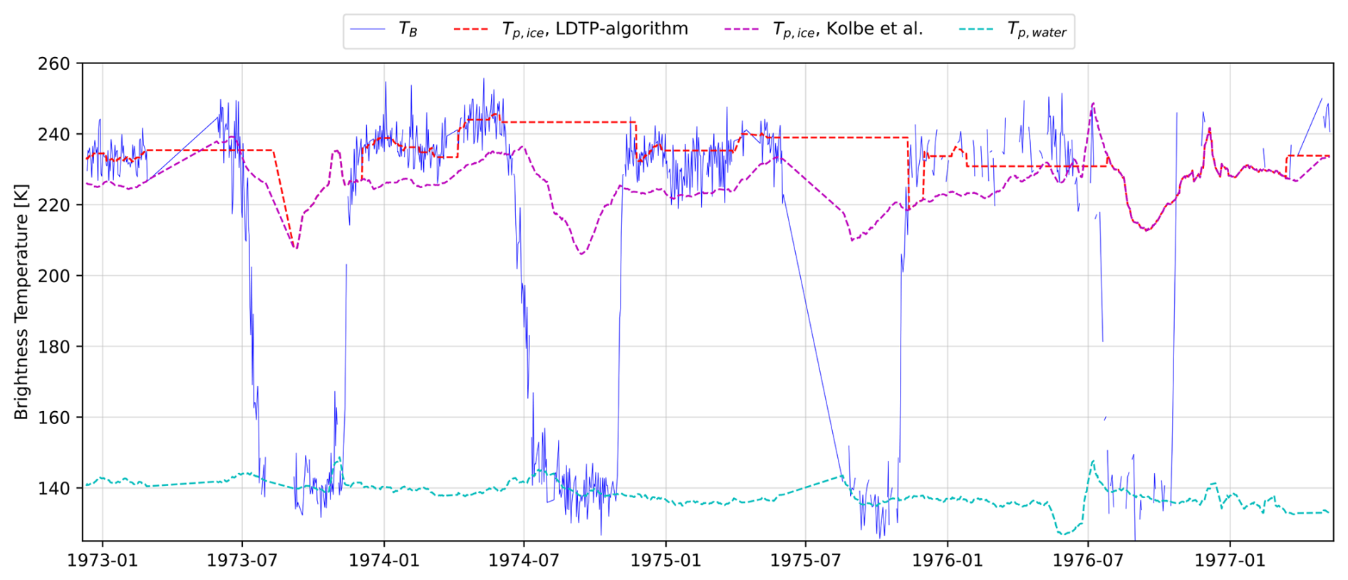 Baffin Bay cycles between open water during summer and consolidated FYI during winter, as shown in Fig. 7. The Kolbe et al. (2024) ice tie points are consistently lower than the tie points of the LDTP algorithms, and the LDTP tie points follow the TB closely. However, LDTP tie points closely follow the Kolbe et al. (2024) tie points by the end of 1973, 1976, and 1977, due to a mixture of a long melt season and missing data, which means that the age limit of the tie point is activated and the old, hemispheric tie points are used. Figure 7 shows that the new tie points in Baffin Bay replicate the TB variability.
