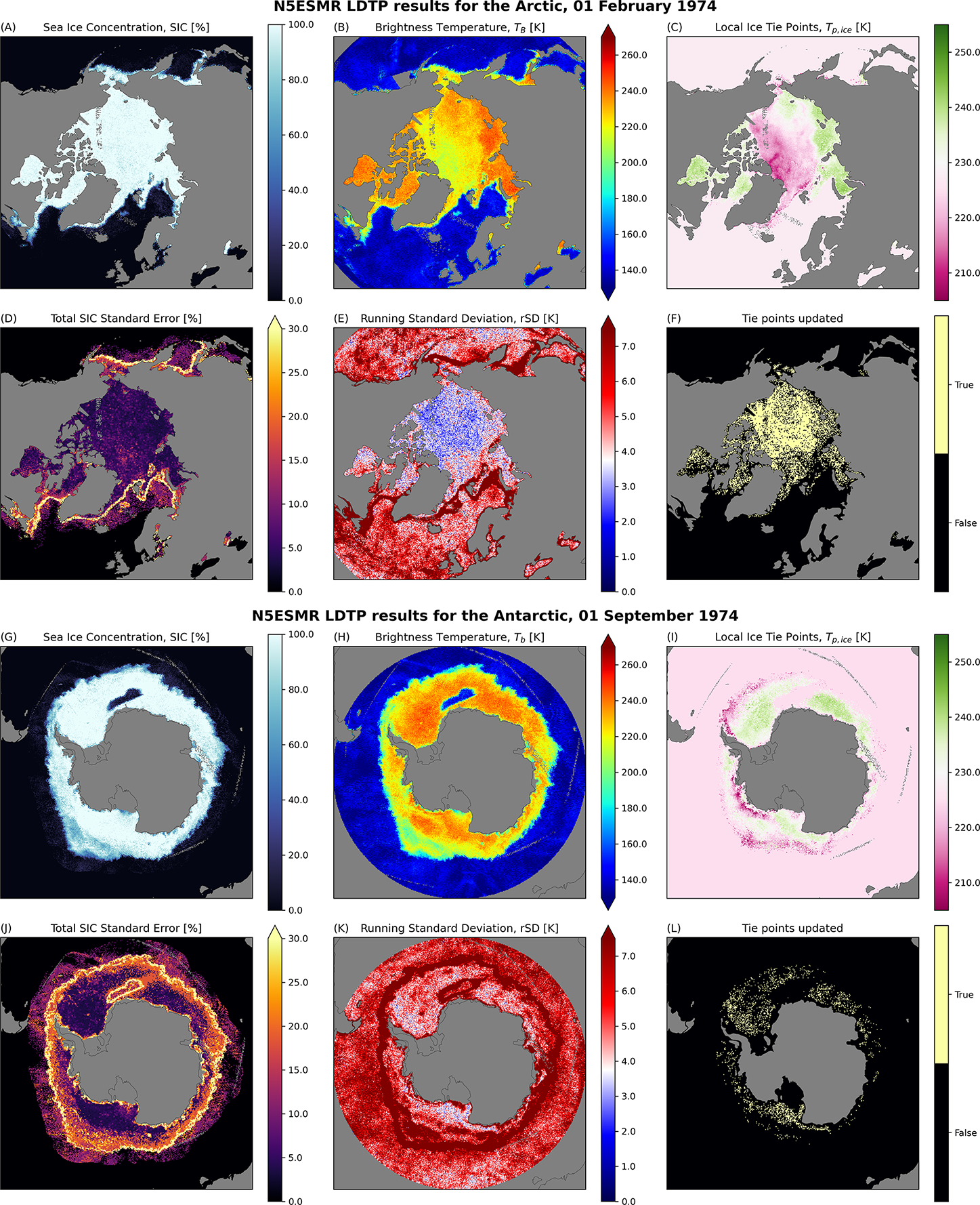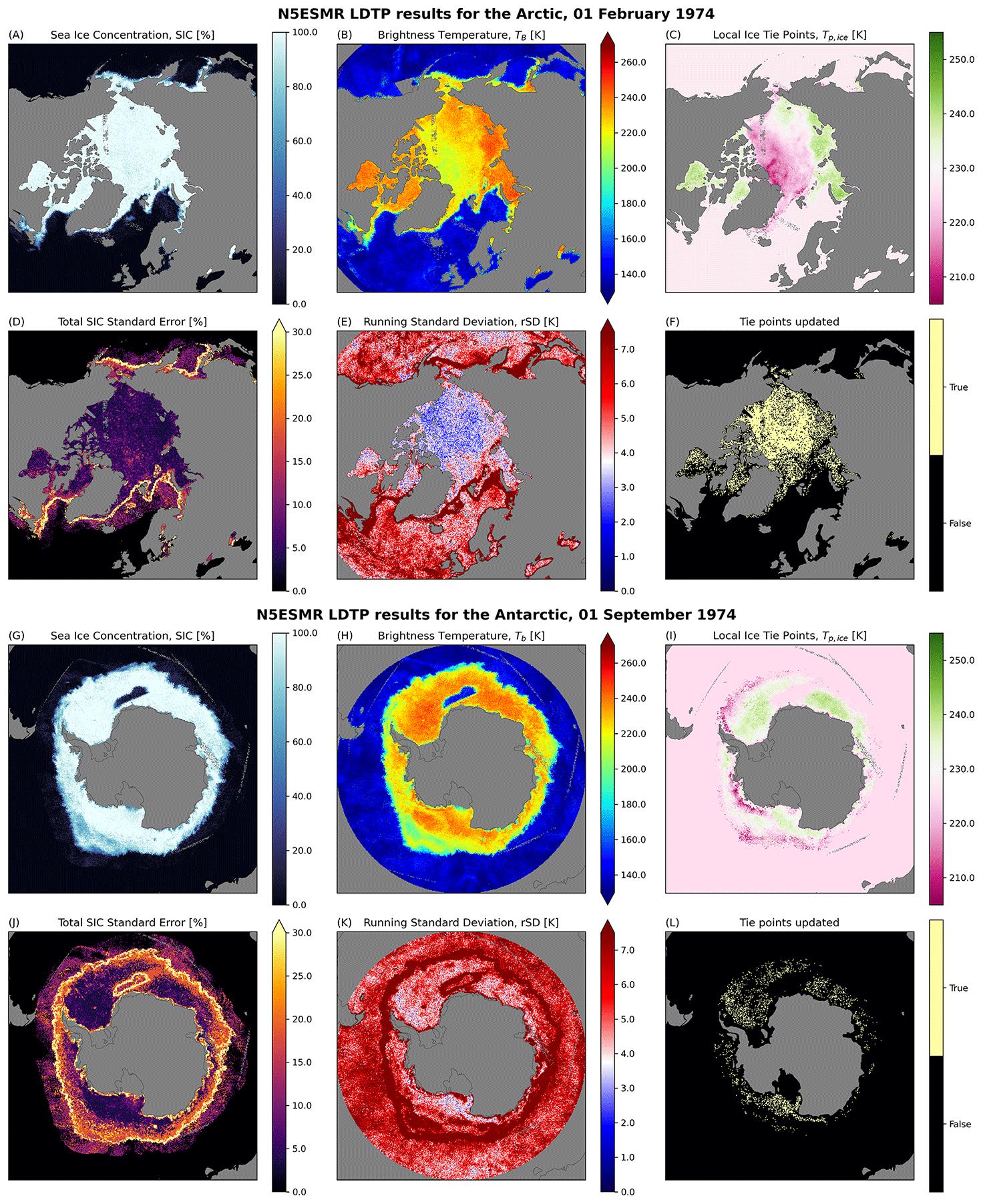 Figure 8SIC, TB, LDTP-based Ice tie points, SIC Standard Error, rSD and updated tie points for the Arctic (1 February 1974) and the Antarctic (1 September 1974), created using the LDTP algorithm. rSD is the running standard deviation for a 15 d period centered at the current date, while “tie points updated” are cells which tie point values have been updated for the present day.