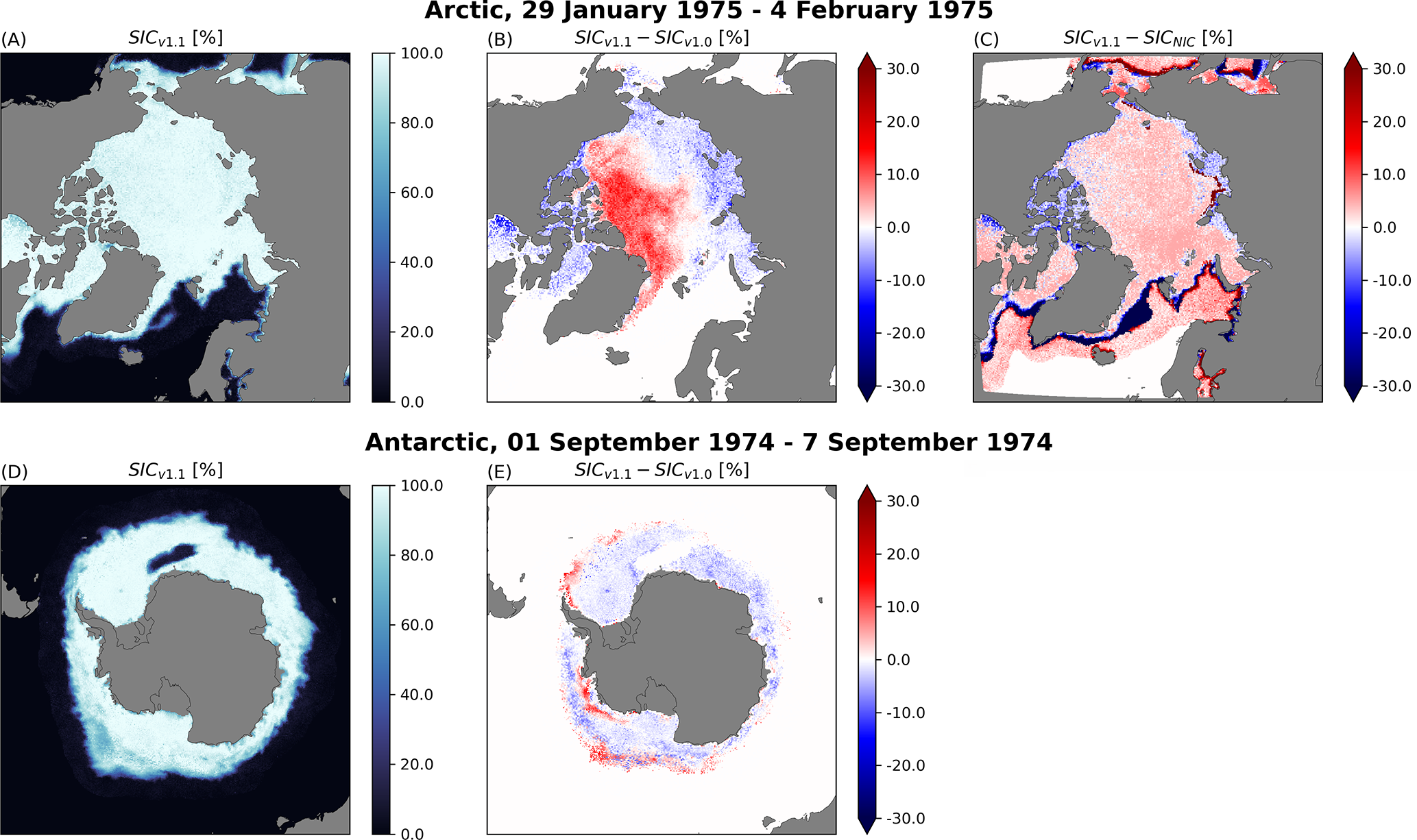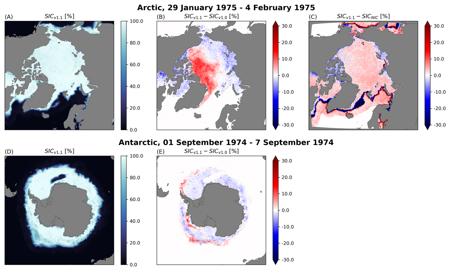 Figure 9The top row shows Northern Hemisphere sea ice concentrations (SIC) of v1.1 (left), the v1.1 SIC–v1.0 SIC difference (middle) and the v1.1 SIC–NIC ice chart SIC difference (right), for the week covered by the ice chart 29 January–4 February 1975. An example of Southern Hemisphere SIC is depicted in the bottom row with the v1.1 SIC (left) and the v1.1 SIC–v1.0 SIC difference (middle) for the week 1. September–7 September 1974.