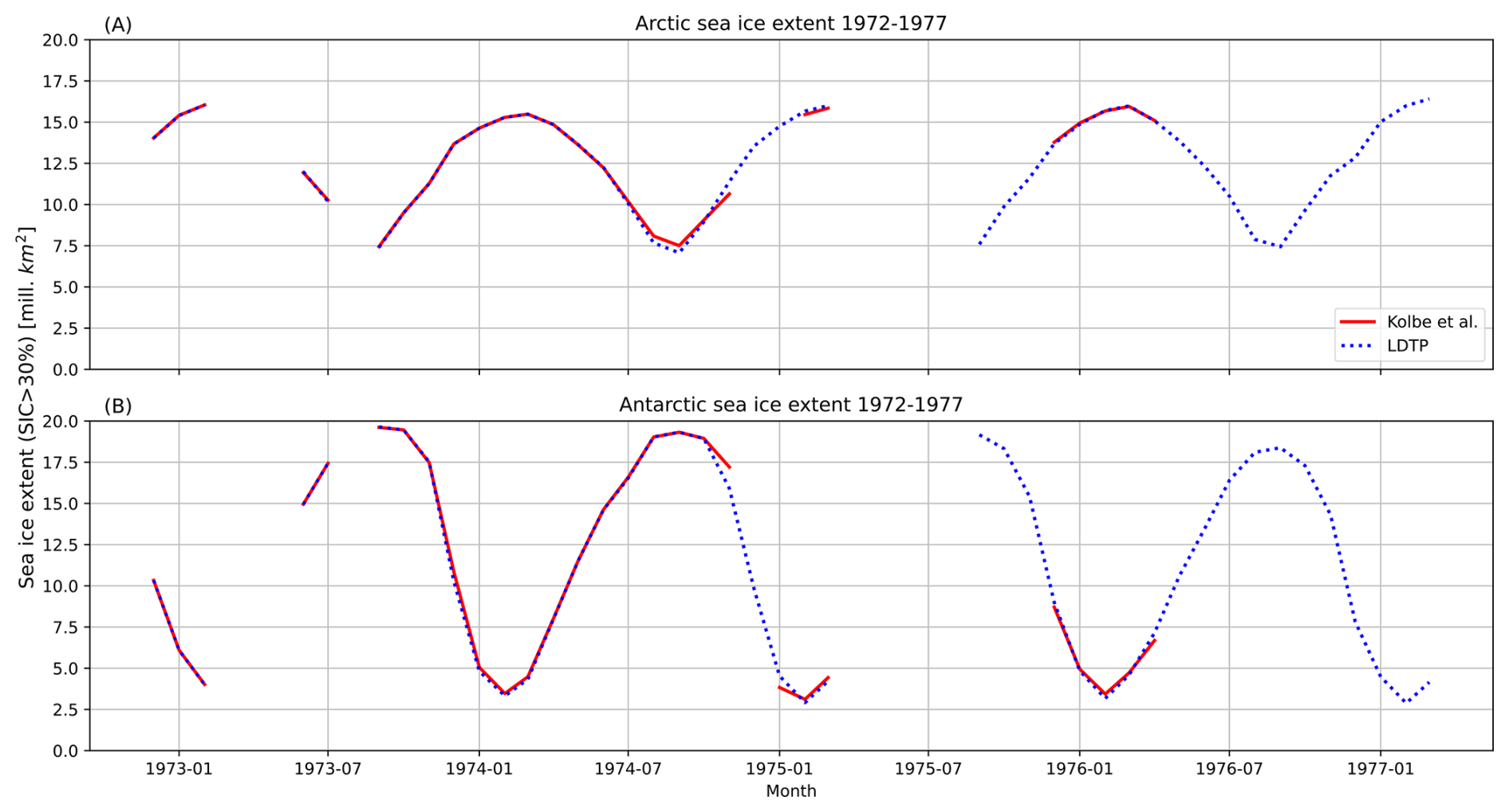 The extent of sea ice is an important indicator of climate change because sea ice affects and responds to changes in the energy balance of the Earth's surface and the ocean and atmospheric circulation (e.g., Notz and Stroeve, 2016; Masson-Delmotte et al., 2021; Moore et al., 2022; Silvano et al., 2025). Long and consistent observational records of the extent of sea ice, dating back to the beginning of the 1970s, are critical to understanding these processes and to validate models (Fogt et al., 2022; Goosse et al., 2024). For example, air–sea heat flux in the Nordic Seas, linked to atmospheric and ocean circulation and sea ice, experienced a persistent change in the late 1970s (Moore et al., 2022). The extent of Antarctic sea ice experienced a springtime drop in 2016 (Turner et al., 2017). In the mid-1970s, the extent of Antarctic sea ice also experienced a drop, which was comparable to and yet less persistent than the 2016 drop (Goosse et al., 2024).