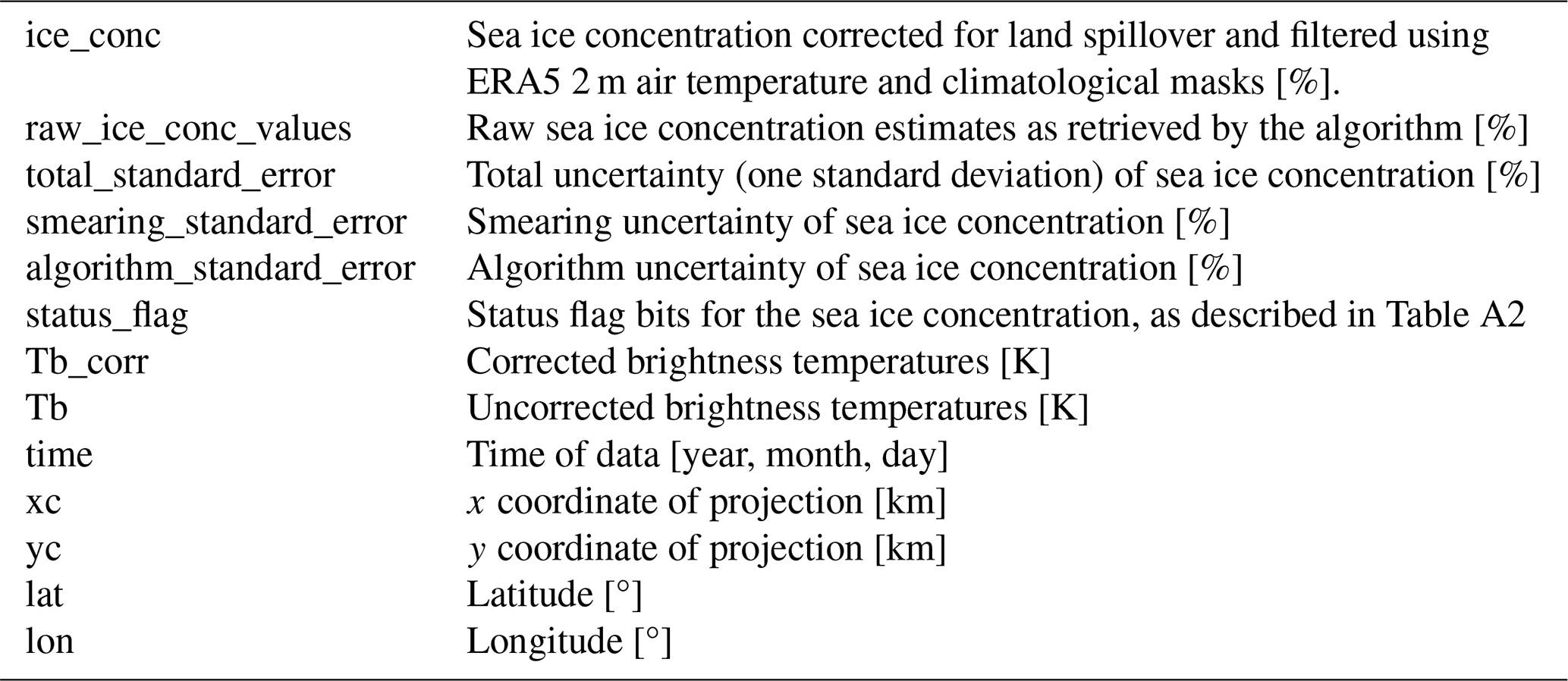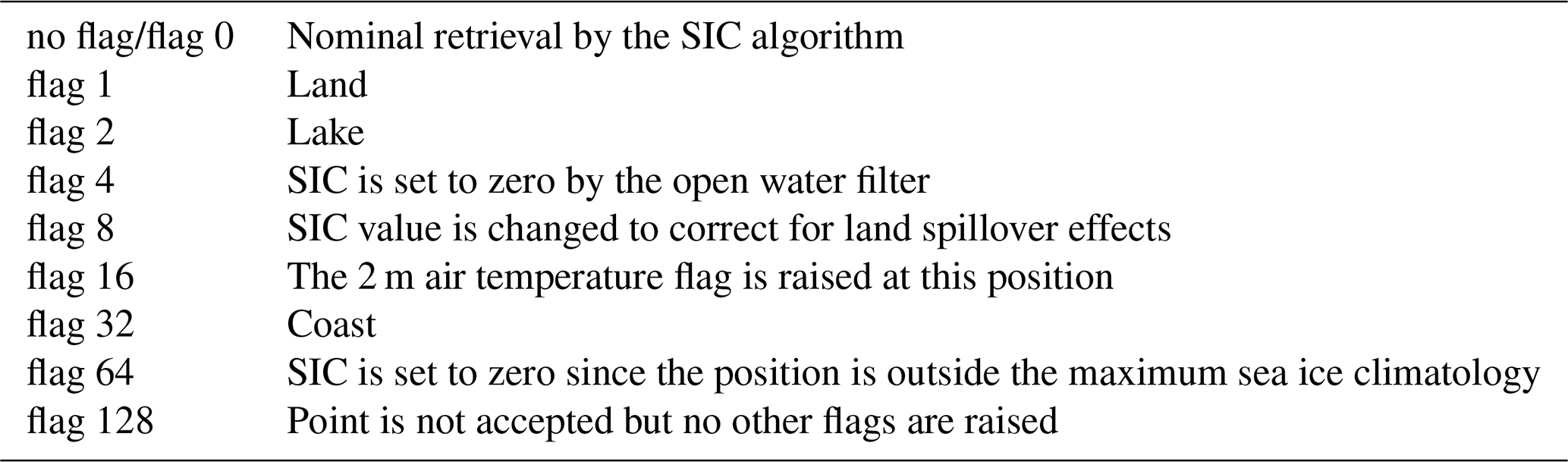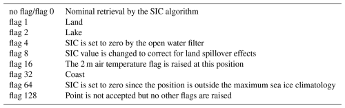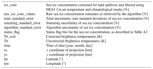 The v1.1 dataset is publicly available (Tonboe et al., 2025). It is gridded on a 25 km EASE 2.0 grid (Brodzik et al., 2012) and is available as daily NetCDF files for all dates where valid N5ESMR data are available. To maintain consistency with v1.0 and other similar SIC datasets, we have maintained the file structure, variable names, and status flags, which means that the dataset can be used as a direct replacement for v1.0. An overview of the dataset variables can be found in Tab. A1. There is a description of the status flags in Tab. A2. We have not included the LDTP algorithm specific variables: rSD, rM, Tp,ice, τ, and Tp,water to be consistent with the v1.0 data structure. However, these parameters can be derived using the available code (see below) and the corrected brightness temperatures (TB_corr) of the v1.1 dataset.