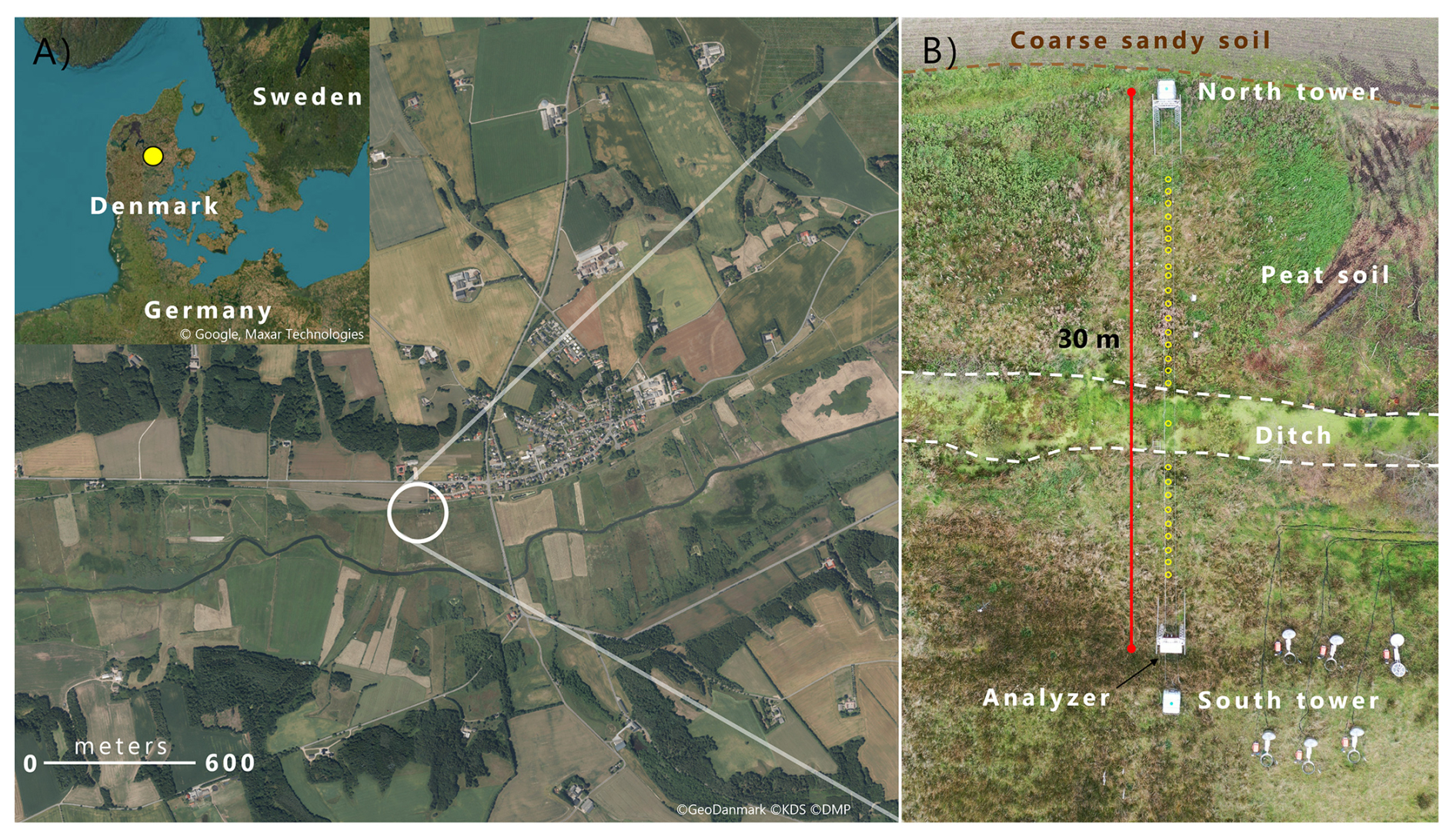 Figure 1(A) The Vejrumbro location in Jutland (N 56.43819 E 9.54527 (WGS 84)) in the Nørre Å valley near the village of Vejrumbro. The grey circle marks the placement of the SkyLine2D system. Satellite images: © Google Earth. (B) Drone image of the measurement transect (27 September 2023) after flux measurements had stopped. Dashed brown line marks the approximate boundary between the agricultural field, coarse sandy soil (north) and the peat/organic soil (south). The red line marks the end points of the SkyLine2D system (30 m). The open yellow circles (n= 27) mark the approximate position of individual collars across the transect of the field (24 m in length) where greenhouse gas fluxes were measured. The ditch is located between the dashed white lines. The analyser was placed at the south tower. Elevation above sea level along the 24 m collar transect varied from 3.77 m in the south to 4.06 m in the north.