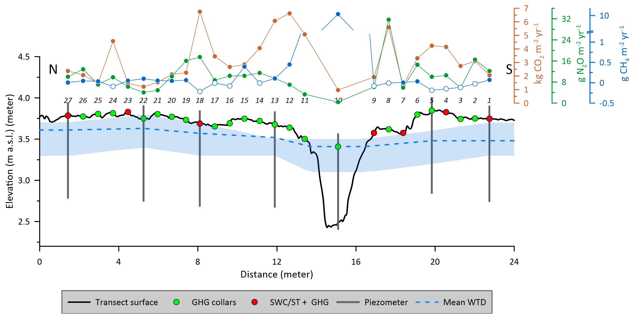 Figure 2Schematic representation of the measurement transect at Vejrumbro and associated measurement variables. The annual cumulative fluxes of CO2 (red) (kg CO2 m−2 yr−1), N2O (green) (g N2O m−2 yr−1) and CH4 (blue) (g CH4 m−2 yr−1) are shown for each collar across the measurement transect at Vejrumbro. Closed and open symbols for CH4 represent net cumulative emission and uptake, respectively. Mean groundwater level is the mean water table elevation measured in piezometers (blue dashed line) with shaded blue area represent maximum and minimum observed groundwater elevation. GHG collars (green symbols) mark the positions of greenhouse gas flux measurements of CO2, CH4 and N2O. SWC/ST + GHG mark the positions where volumetric soil water content (SWC) and soil temperature (ST) at 5 cm depth were measured alongside greenhouse gas fluxes. Numbers on top of plot show the collar numbers (from 1–27). N and S mark the north and south ends of the transect (see Fig. 1B). The peat depth was at least one meter in all points. Elevation is given meters above sea level (m a.s.l.).