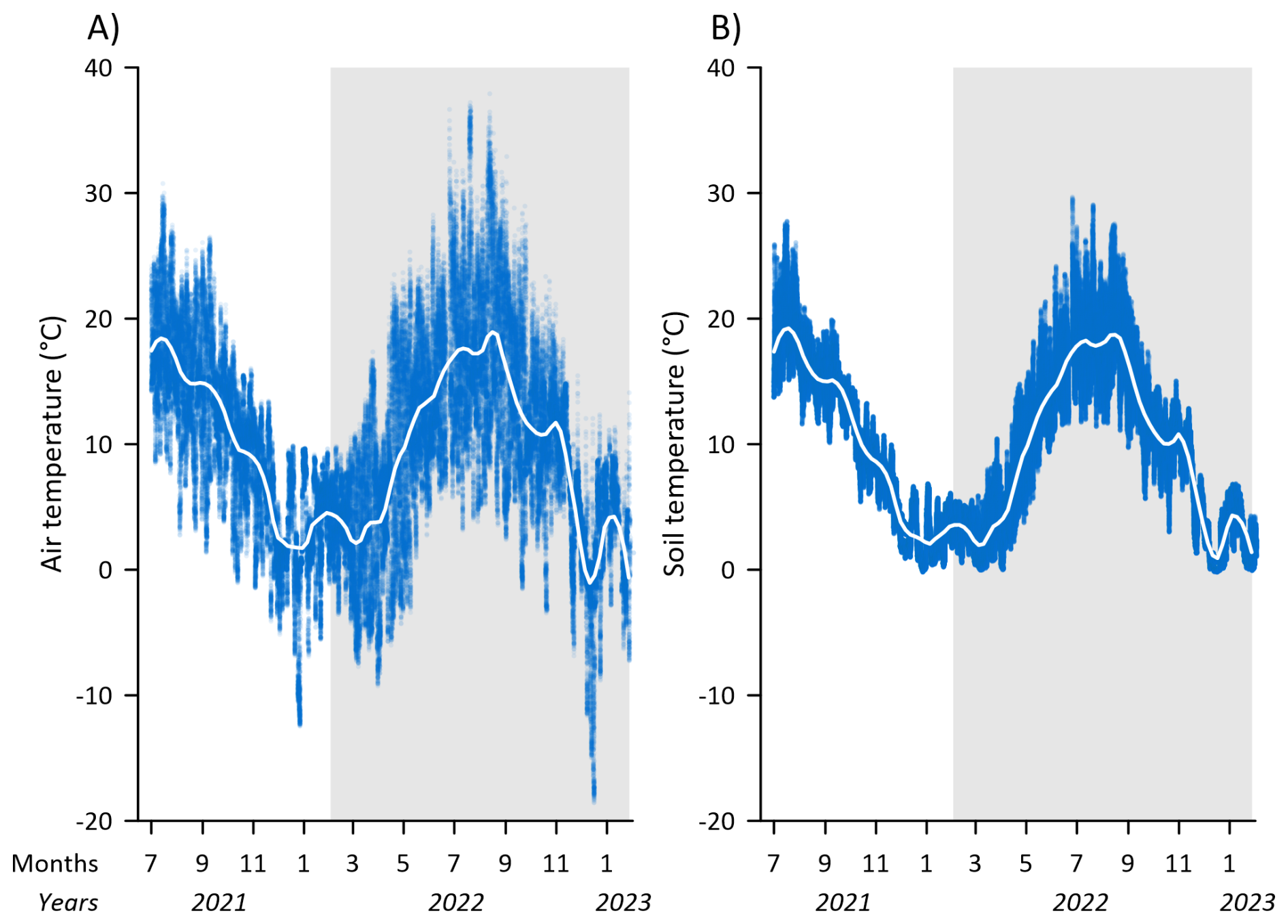 Figure 4Time series of (A) air temperature in °C measured at 2 m height above the surface and (B) soil temperature (°C) at 5 cm depth for collars 4, 7, 9, 23 and 27 along the measurement transect. The blue dots are the raw 5 min measurements of air temperature and the white lines represent LOESS fit to show overall seasonal trend. The periods of GHG measurements with the SkyLine2D system are shown with the shaded area.