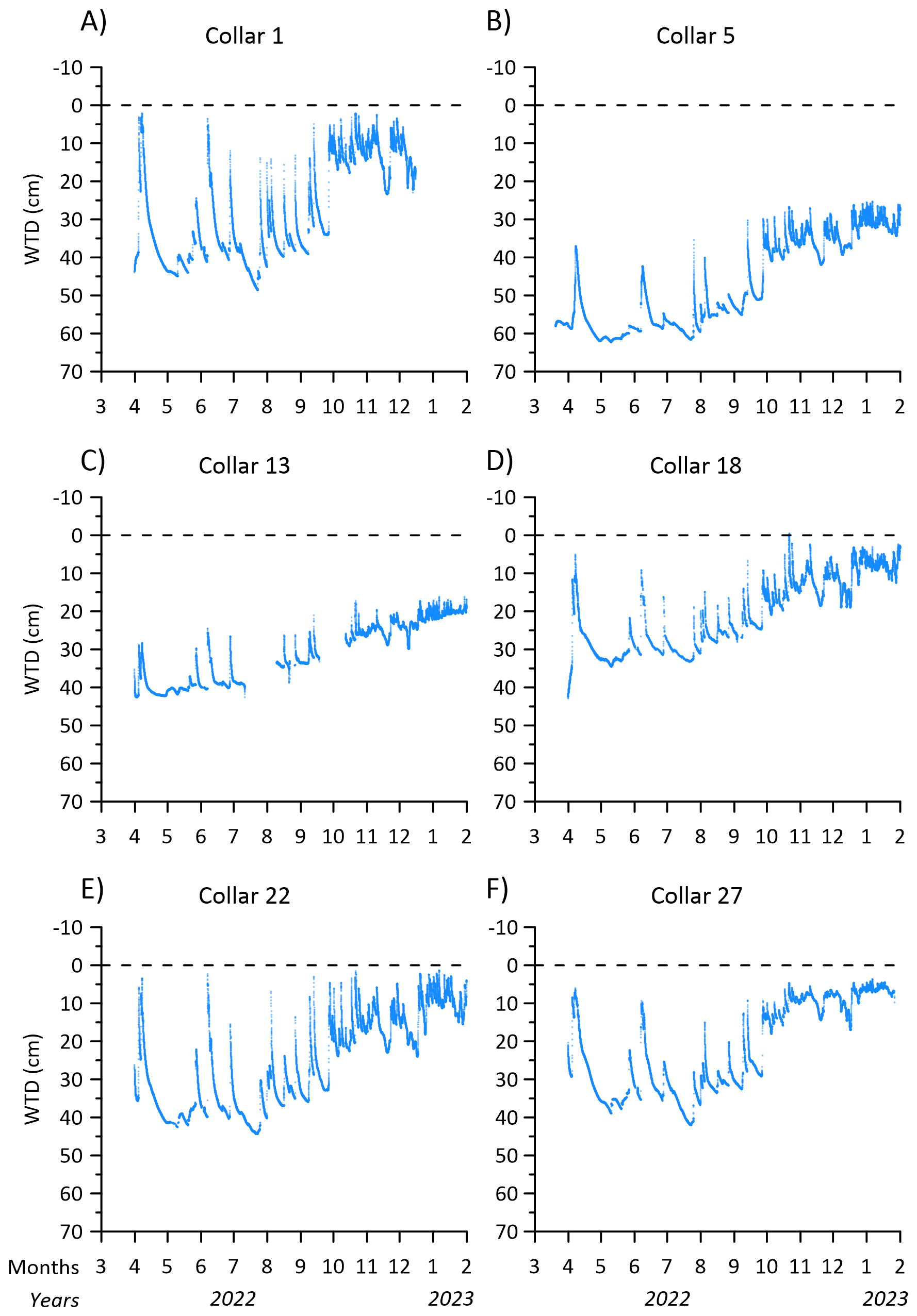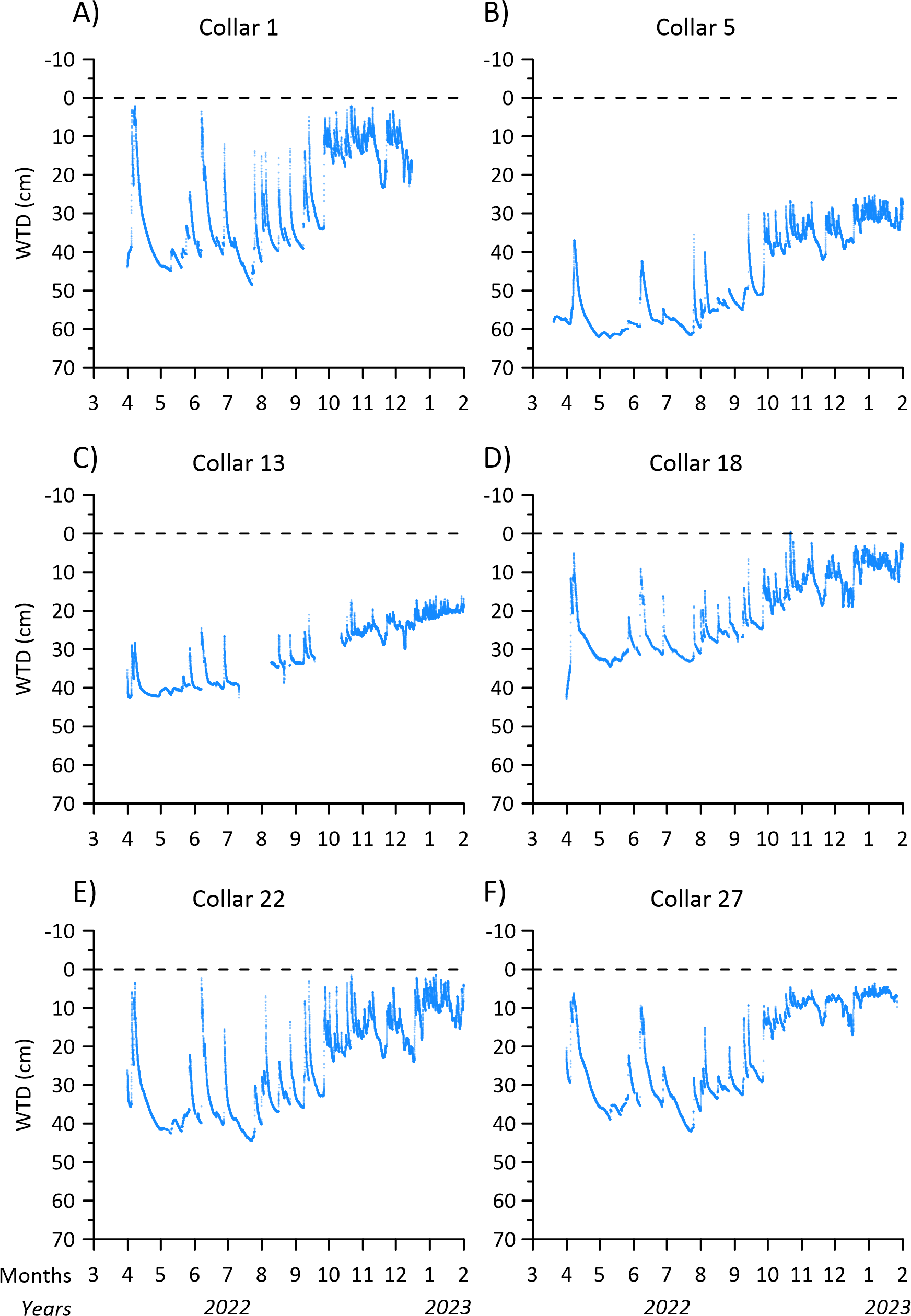 Due to instrument failure the temporal coverage of soil moisture in the topsoil (5 cm) was not similar across the transect (Fig. 6A–F). For collars 18, 23 and 27 the entire period of greenhouse gas measurements was covered by soil moisture measurements (Fig. 6D–F). While SWC for collars 1, 9, 18, 23 and 27 was similar in the winter periods (around 0.55 cm3 cm−3) the SWC for collar 18 decreased to lower minima between 0.1–0.2 cm3 cm−3, than the minima observed between 0.3–0.4 cm3 cm−3 for collars 23 and 27 in the summer periods (Fig. 6, Table 2). Similar for all collars it was observed that SWC was more variable in summer, responding similarly as WTD to precipitation events (Fig. 6, Table 2). Since plants were removed regularly from the collars the decrease of SWC for collar 18 cannot be explained by plant transpiration, and the dynamic behaviour could indicate the impact of soil evaporation, but the different levels of SWC also show that there is spatial variation across the transect in the water retention properties of the peat soil that will impact the rate of drying. However, it cannot be ruled out that the SWC sensor at collar 18 experienced malfunction or that soil contact was lost in the dry periods of 2022 (Fig. 6D) which could lead to erroneous and too low SWC. Therefore, these data should be considered with care.