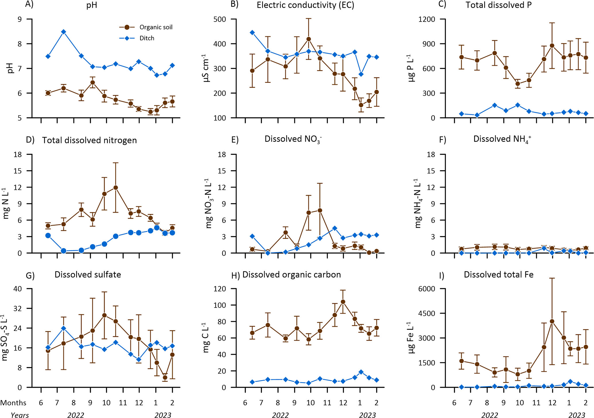 Figure 7Groundwater (brown closed circles) and ditch water (closed blue diamonds) chemistry at Vejrumbro for the period June 2022 to February 2023 for (A) pH, (B) Electric conductivity and dissolved (C) total phosphor (P), D) total nitrogen (N), (E) nitrate (NO), (F) ammonium (NH), (G) sulfate (SO), (H) organic carbon and (I) total iron (Fe). Values for organic soils are means for the transect with error bars showing the standard error of the mean (N= 6 per sampling date).