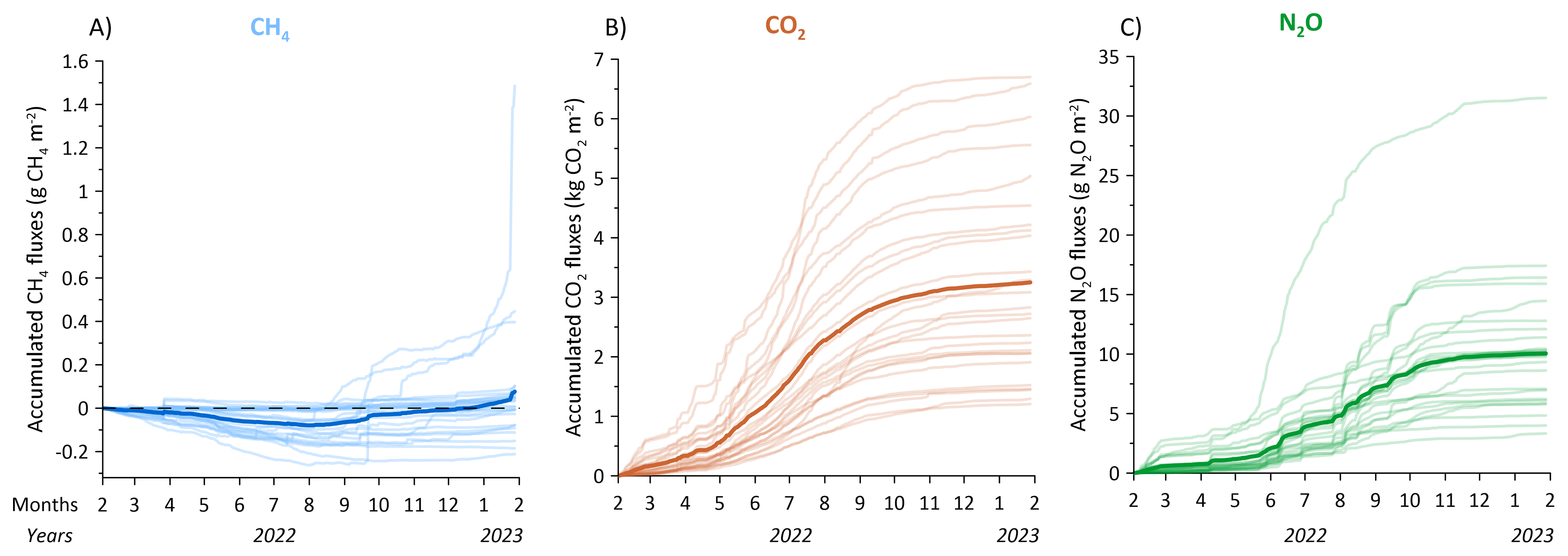 Figure 8Cumulative fluxes of (A) CH4, (B) CO2, and (C) N2O for 26 individual collars along the SkyLine2D transect in the measurement period February 2022 to January 2023. Units for CH4 and N2O are in g CH4/N2O m−2 and for CO2 in kg CO2 m−2. The cumulative fluxes represent the raw dataset. The ditch data was excluded. Transect average is shown as thick lines.