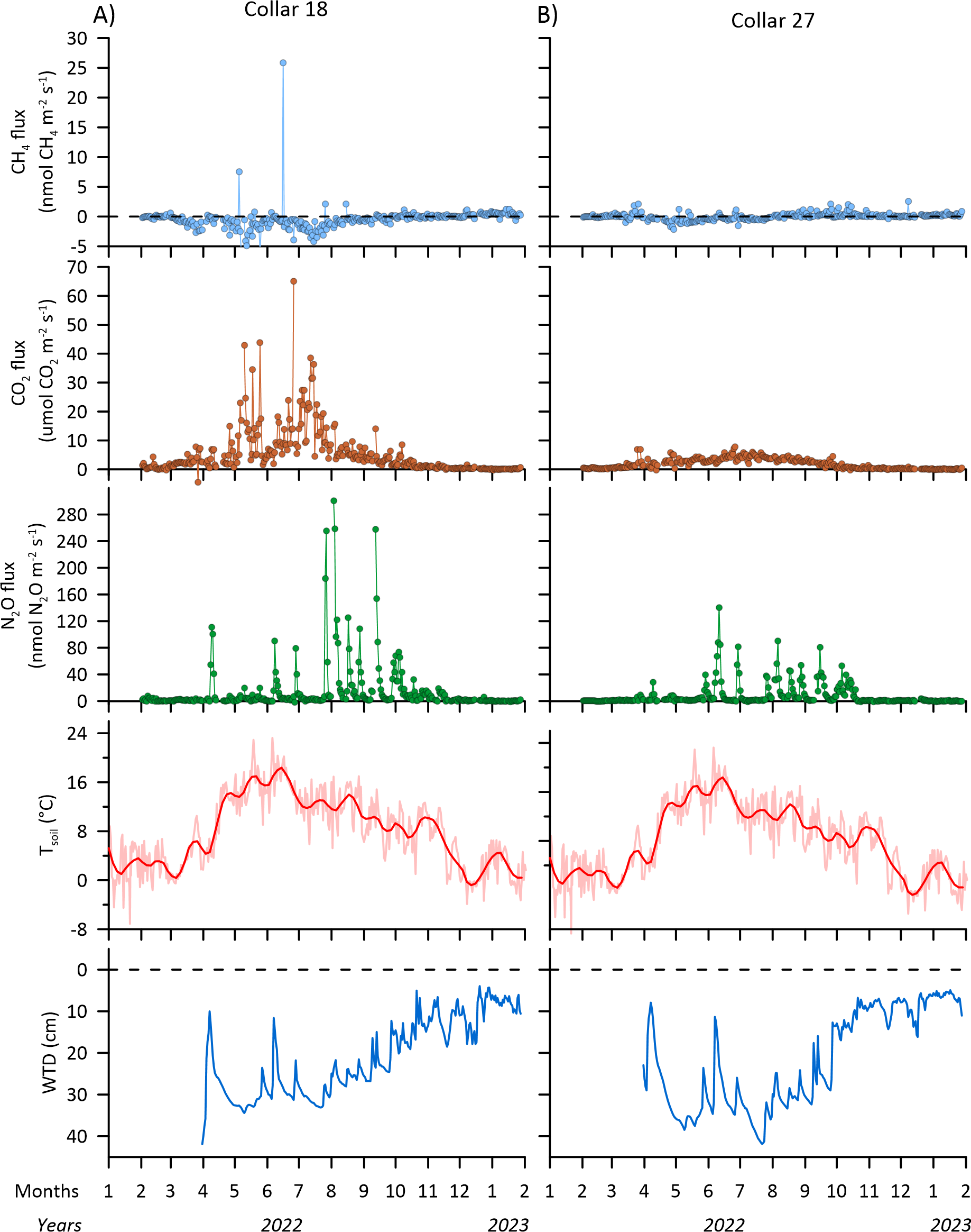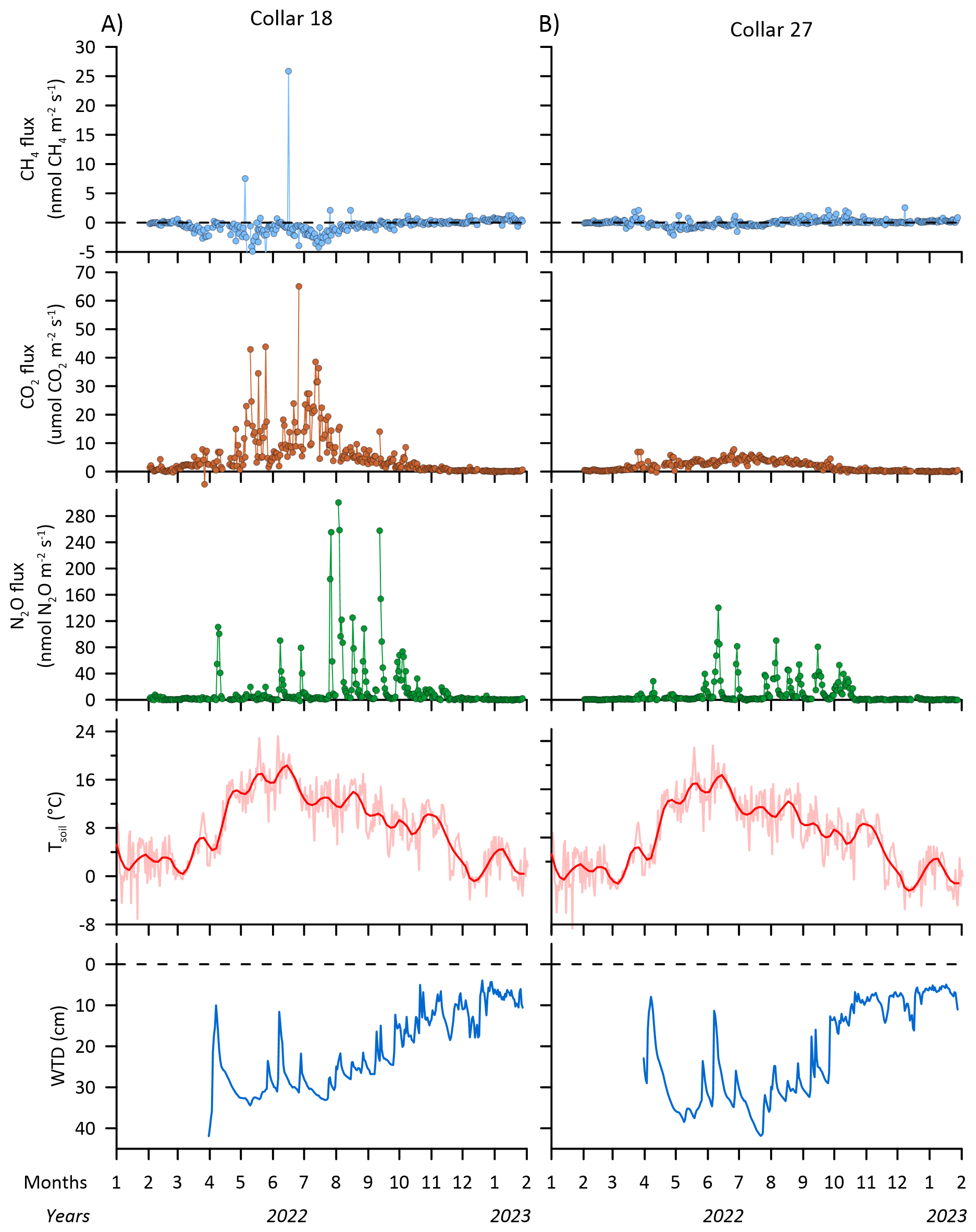 Figure 9Examples of daily average time series of CH4, CO2 and N2O fluxes for collars 18 and 27 at the SkyLine2D transect in Vejrumbro, soil temperature (ST) in celsius (°C) and groundwater table depth (WTD) in cm below terrain is shown in two lower panels for the measurement period from February 2022 to January 2023.