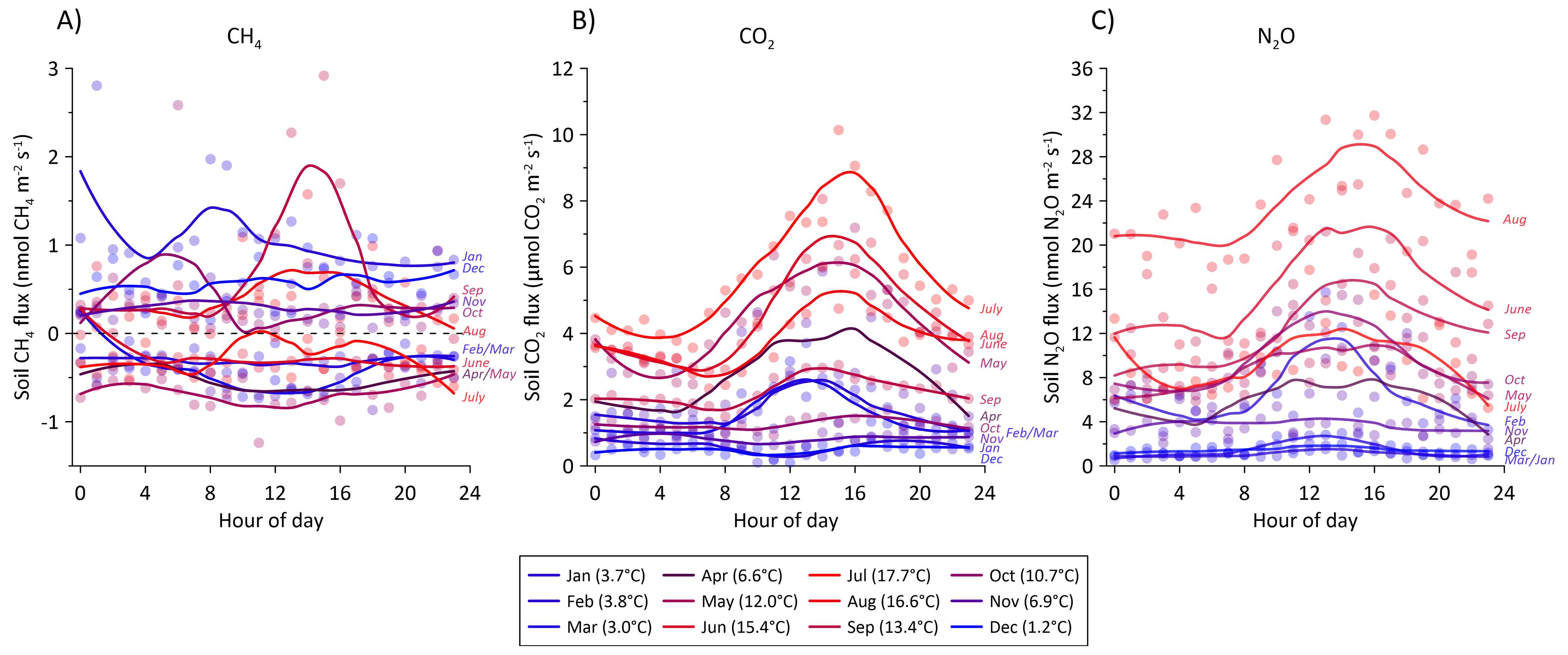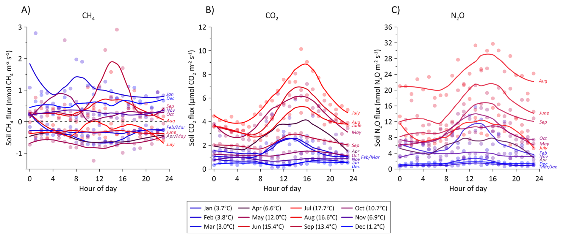 Figure 10Average hourly flux for all soil collars of (A) CH4, (B) CO2, and (C) N2O during a 24 h period. The diurnal variation is split between each month during the 2022–2023 measurement period. The fluxes were assigned the hour of measurement during the day and averaged per month. Color shade between blue and red corresponds to average air temperature for the specific month shown in parenthesis in the figure legend. Solid lines are loess fits for visualization of the diurnal variation in each month.
