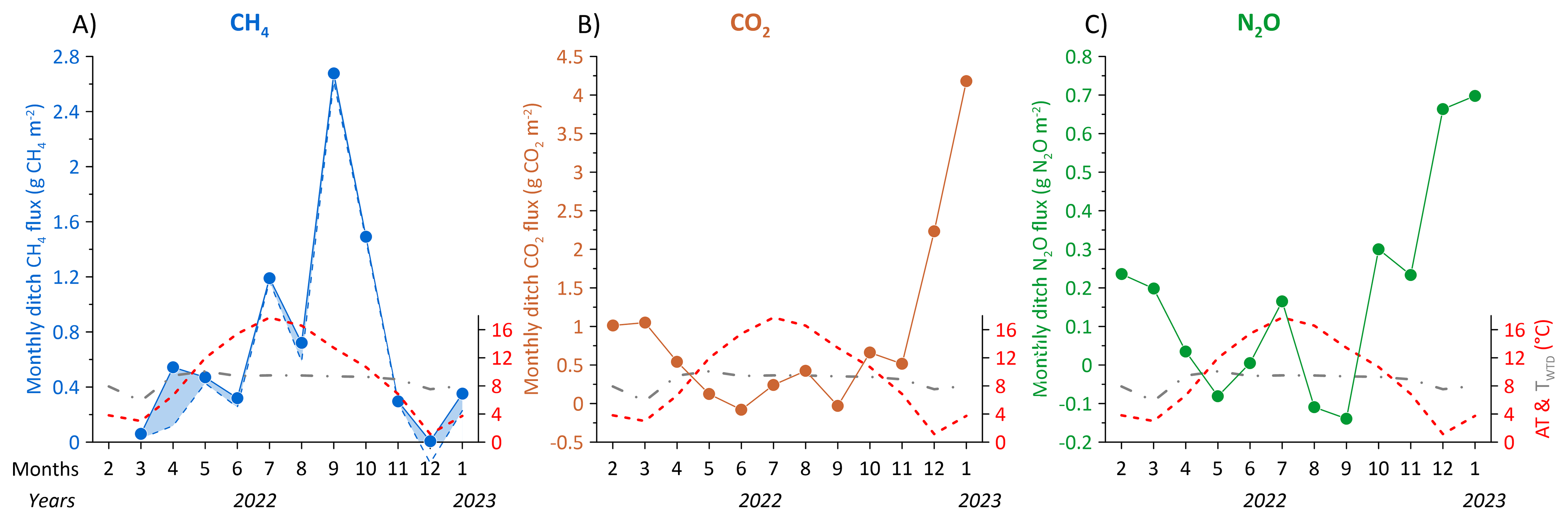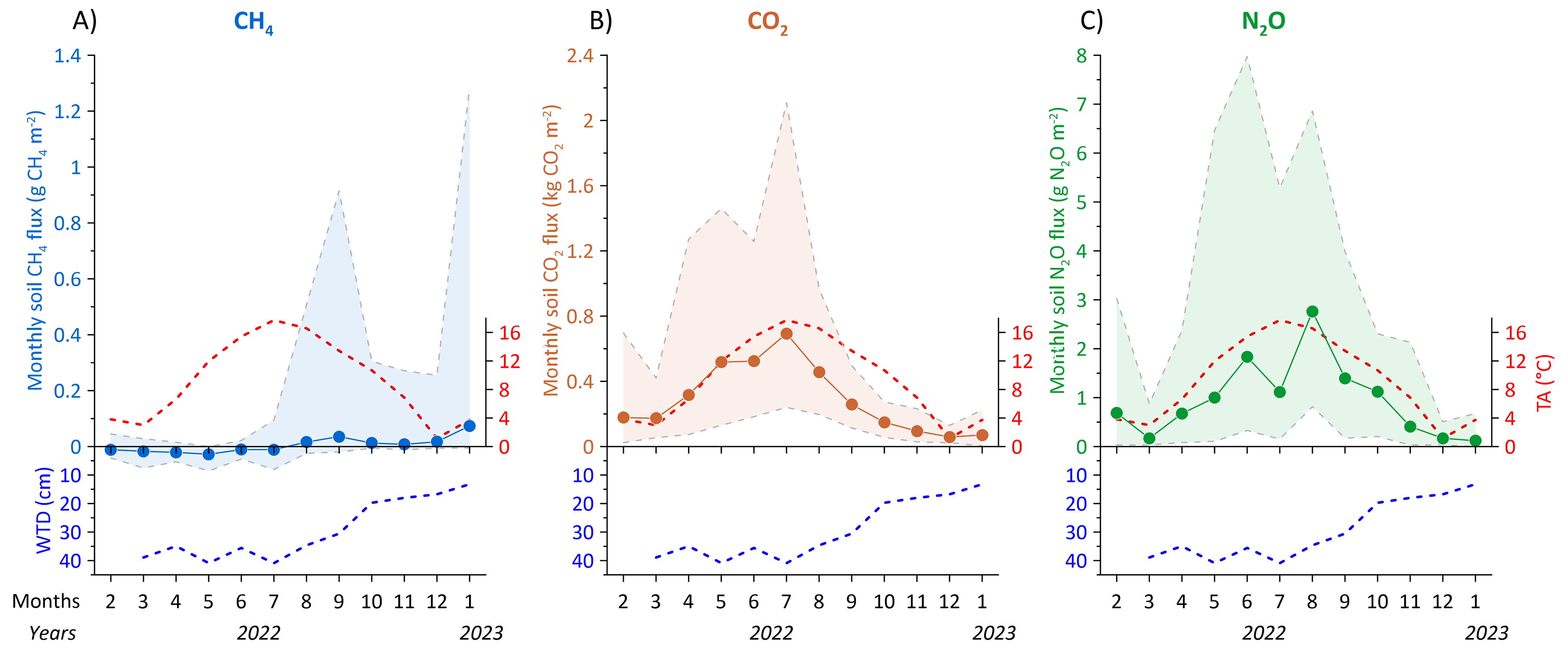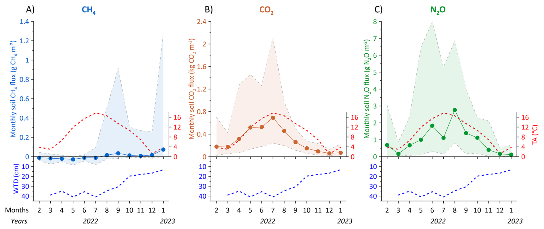 Figure 11Monthly summed soil fluxes of (A) CH4 in g CH4 m−2, (B) CO2 in kg CO2 m−2, and (C) N2O in g N2O m−2 for all organic soil collars for the measurement period from February 2022 to January 2023. Shaded areas for CH4, CO2 and N2O graphs represent the maximum and minimum monthly average fluxes. Blue dashed line below CH4, CO2 and N2O represent the measured monthly average transect groundwater table depth (WTD) in cm below terrain. Red dashed line shows the monthly average air temperature (TA).
