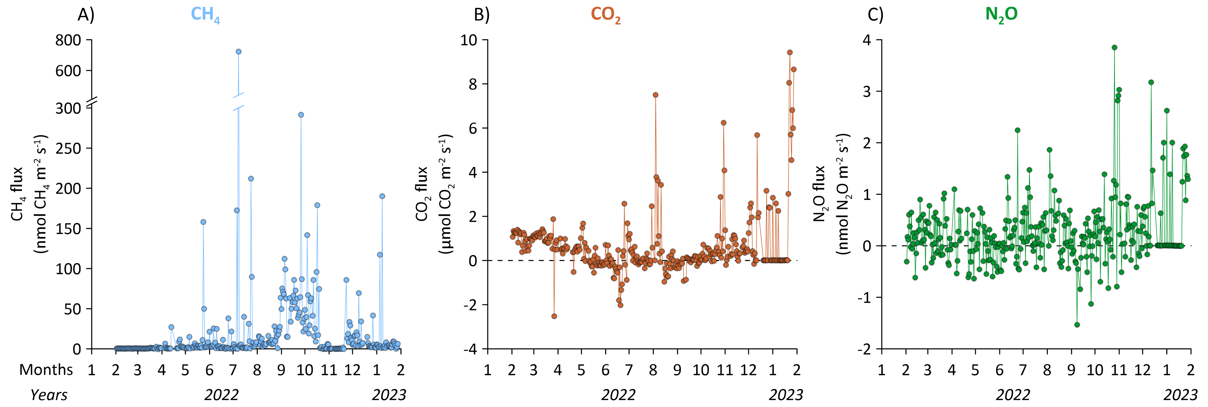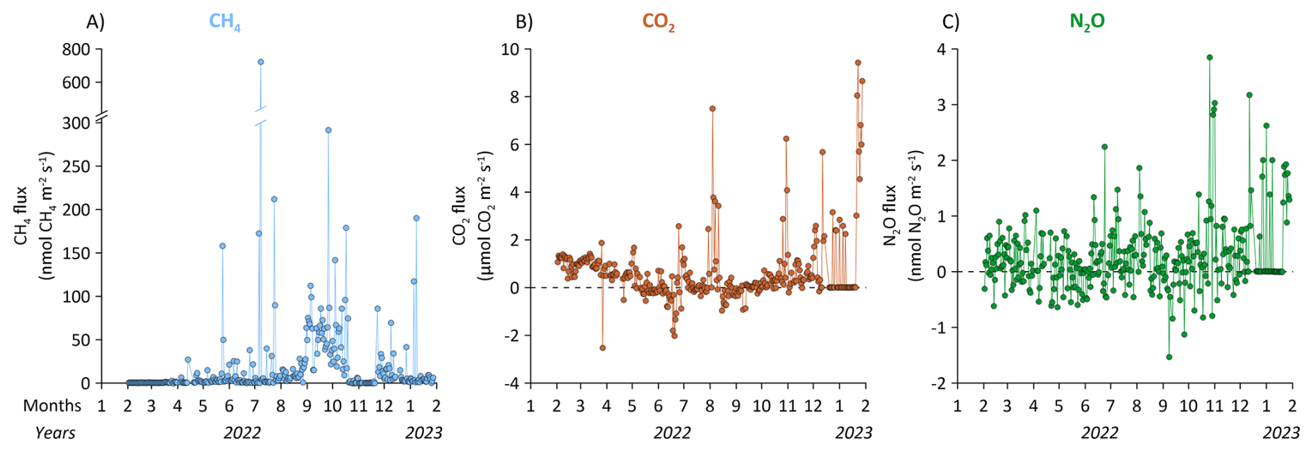For CO2 and N2O, the seasonal pattern is reversed with lowest fluxes during the warmest periods, approaching net zero or even net negative fluxes (Fig. 14B and C).