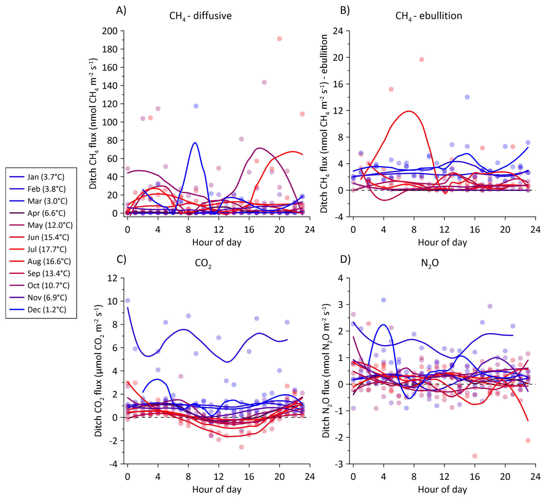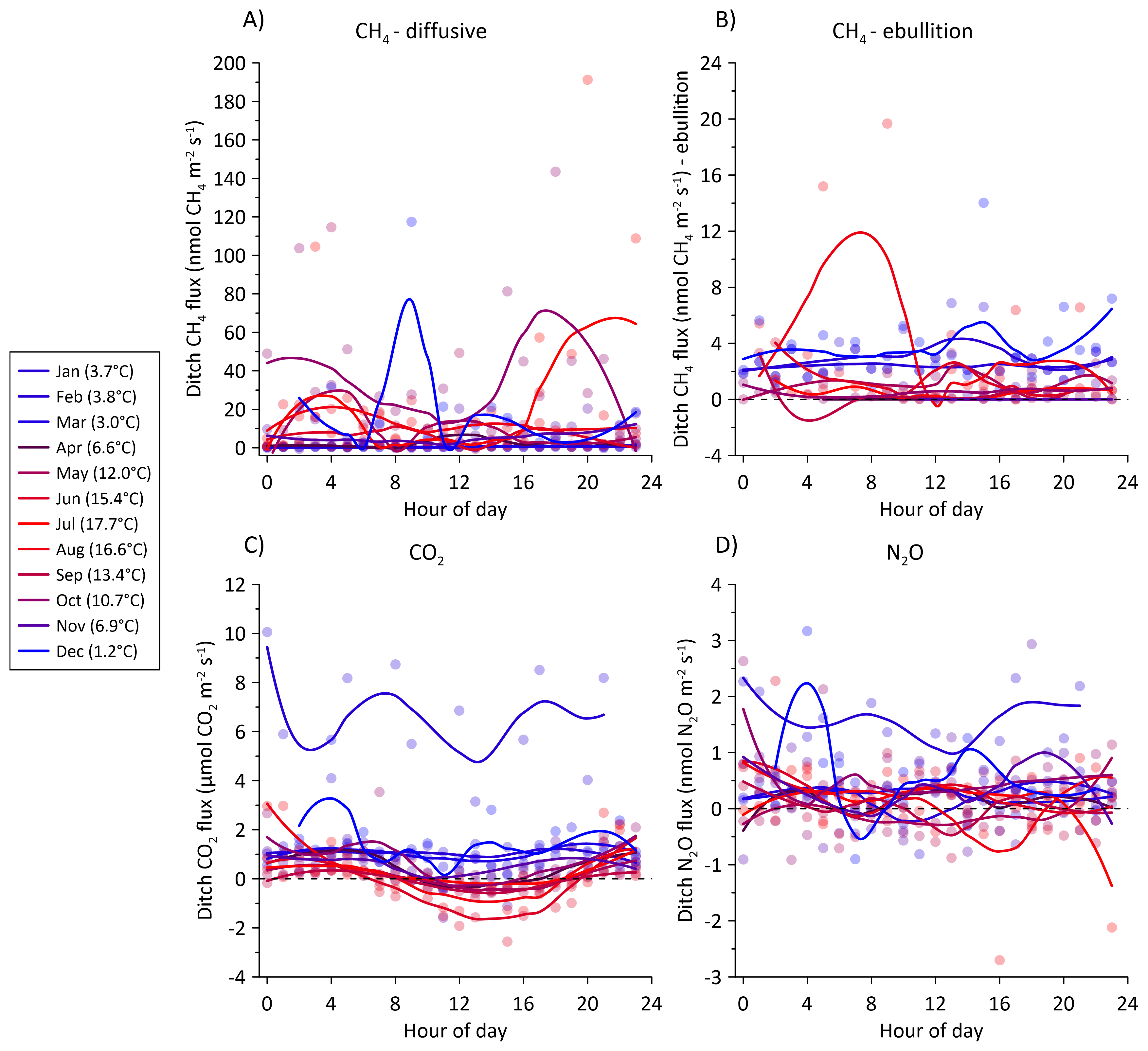 Figure 13Average hourly fluxes for the ditch collar of (A) diffusive CH4 fluxes, (B) CH4 ebullition fluxes, (C) CO2, and (D) N2O during a 24 h period. The fluxes were assigned the hour of measurement during the day and averaged per month. The diurnal variation is split between each month during the 2022–2023 measurement period. Color shade between blue and red corresponds to average air temperature for the specific month shown in parenthesis in the figure legend. Solid lines are loess fits for visualization of the diurnal variation in each month. Note different axes.