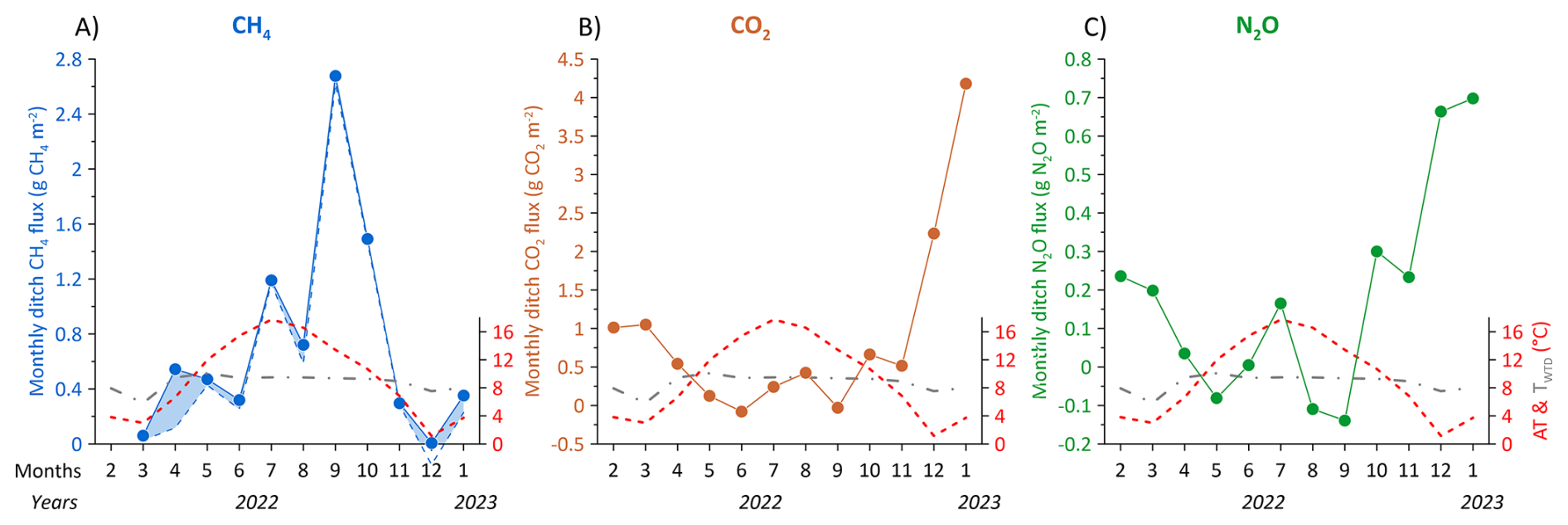 Figure 14Monthly summed ditch fluxes of (A) CH4 in g CH4 m−2, (B) CO2 in g CO2 m−2 and (C) N2O in g N2O m−2 for the measurement period from February 2022 to January 2023. In (A) the blue dashed line is the contribution of diffusive fluxes and the shaded blue area between the full and dashed blue lines represent the monthly contribution of ebullition to the total flux. Red and grey dashed lines show the monthly average air (AT) and groundwater temperature (TWTD) in °C, respectively.