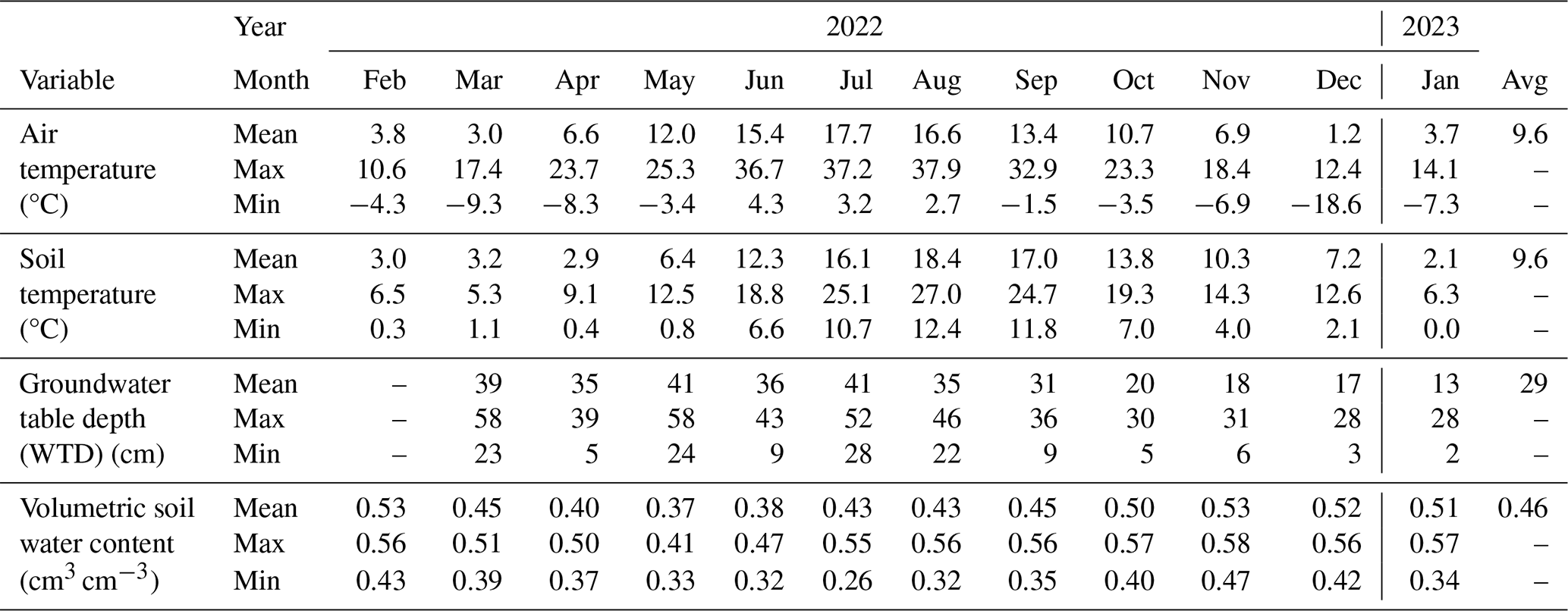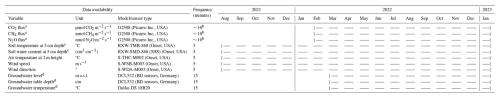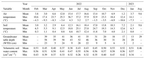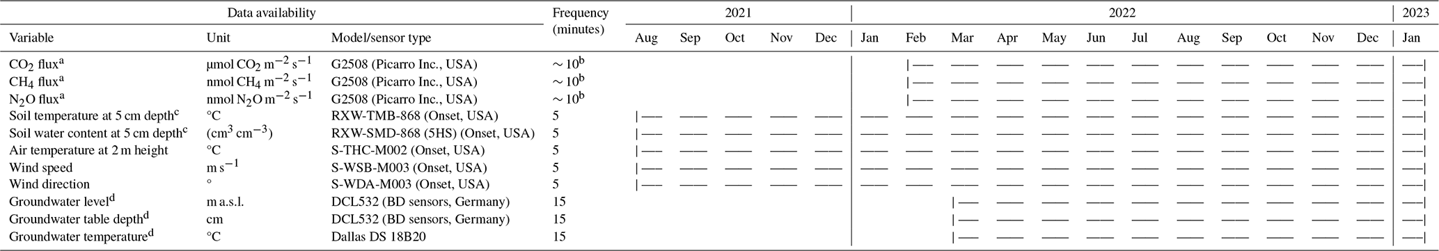 The dataset is comprised of a 12-month time series of net soil fluxes of CO2, CH4 and N2O, accompanied by a longer timeseries of soil temperature and moisture at 5 cm depth, meteorological variables (air temperature, wind speed and direction measured at 2 m height) and a shorter time series of groundwater table level, depth and temperature (Table 1). Due to equipment failure of the SkyLine2D the GHG flux measurements started on 2 February 2022 and ended 28 January 2023 in total 360 d (Table 1). Groundwater level measurements started between 9 to 31 March 2022 (Table 1). All other variables were measured continuously from 1 July 2021, until 31 January 2023 (Table 1). In the period between 7 and 19 December 2022 intermittent periods of snow cover (depth was not measured) on the ground occurred. This snow cover did not impede flux measurements.