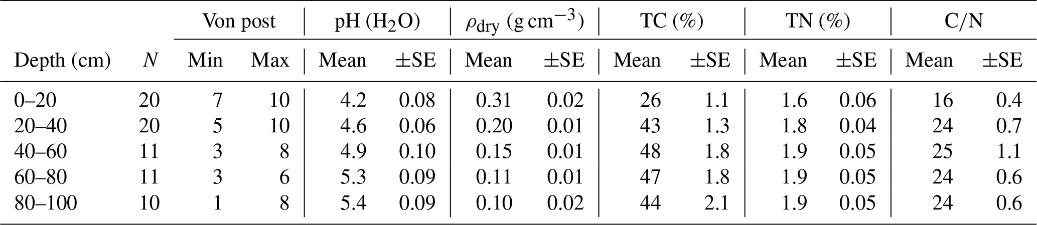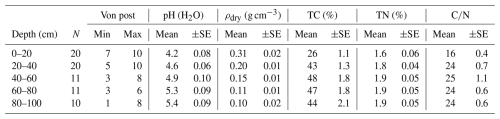 In November 2023 the peat across the SkyLine2D transect was sampled to 1 meter depth using a Russian auger and cores split into five layers of 20 cm thickness. Collars 1, 2, 5, 6, 8, 13–27 were sampled (Fig. 2). For the remaining collars it was not possible to retrieve a sample due to excessive wetness of the peat. The decomposition of the peat samples were assessed by a 10-point Von Post scale of humification (1 = completely undecomposed and 10 = completely decomposed) together with pH determined by suspending peat in demineralized water (1:5 peat:watermix), dry bulk density (g cm−3) and total C and N by dry combustion (g 100 g peat−1 or %).