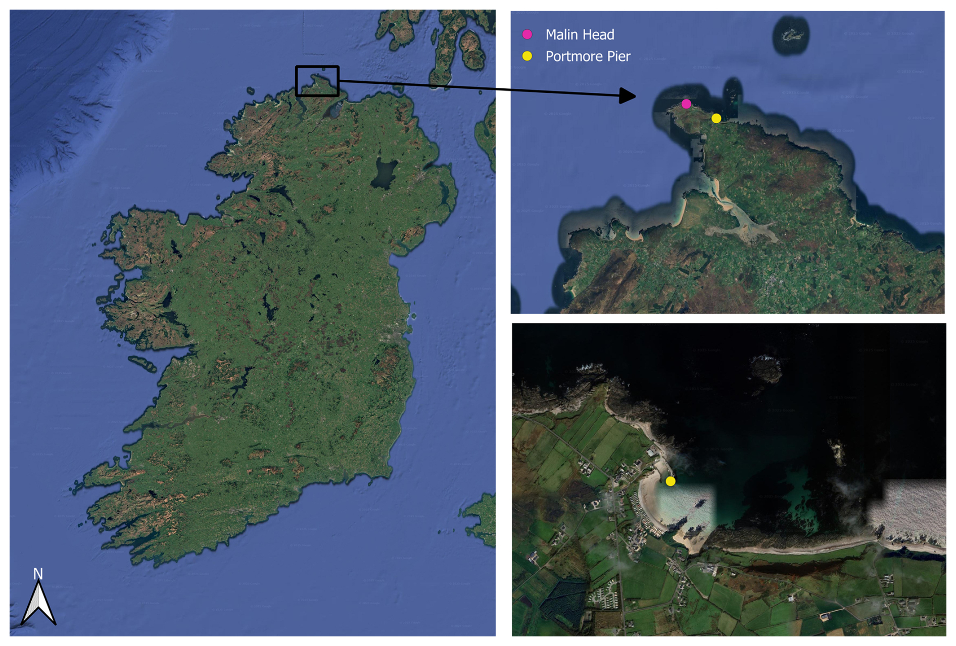 Figure 1Map showing the locations of Malin Head (pink) and Portmore Pier (yellow) (Background map extracted from © 2025 Google: © Landsat/Copernicus, © IBCAO, © Data SIO, NOAA, U.S. Navy, NGA, GEBCO, © Airbus).