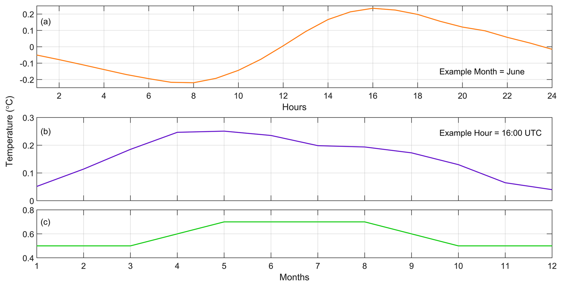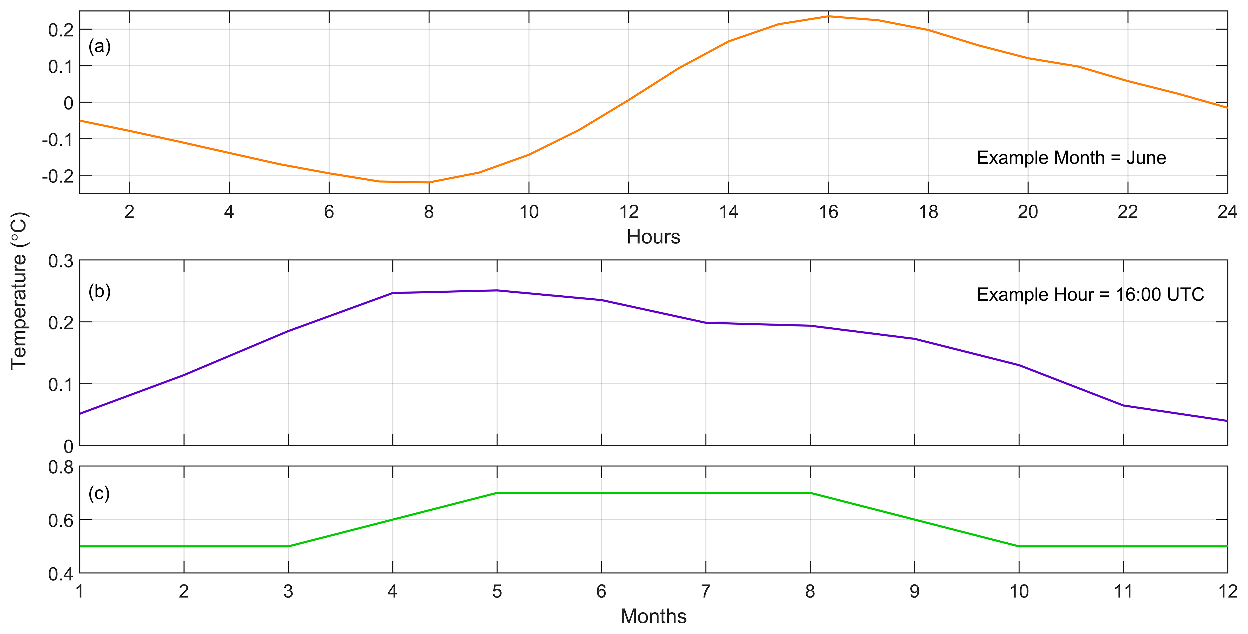 The full time series of diurnal signal (observed less smoothed) is then averaged, per hour, per month, in preparation for removal from Segments 1 and 2. This resulting mean signal displays a strong diurnal cycle in the warmer months (March–October) with minimum temperatures occurring between 06:00 and 08:59 UTC, while the colder months' diurnal cycle had a lower amplitude and minimum temperatures between 00:00 and 02:59 UTC. The full set of mean diurnal signals can be seen in Table S1 in the Supplement, while monthly (June) and hourly (16:00) examples can be seen in Fig. 2a and b respectively.