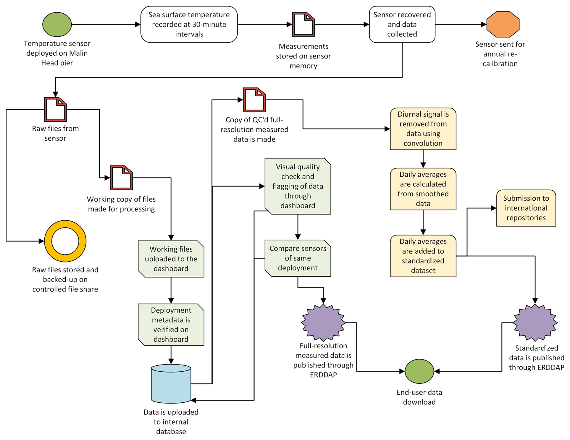 Figure 3Process flow diagram for Malin Head data from sensor deployment to the download of data by the end-user. Green boxes denote steps that occur on the in-house dashboard developed for fixed CTD processing and quality control. Yellow boxes denote steps that only occur in the creation and publishing of the standardised dataset from the measured data.