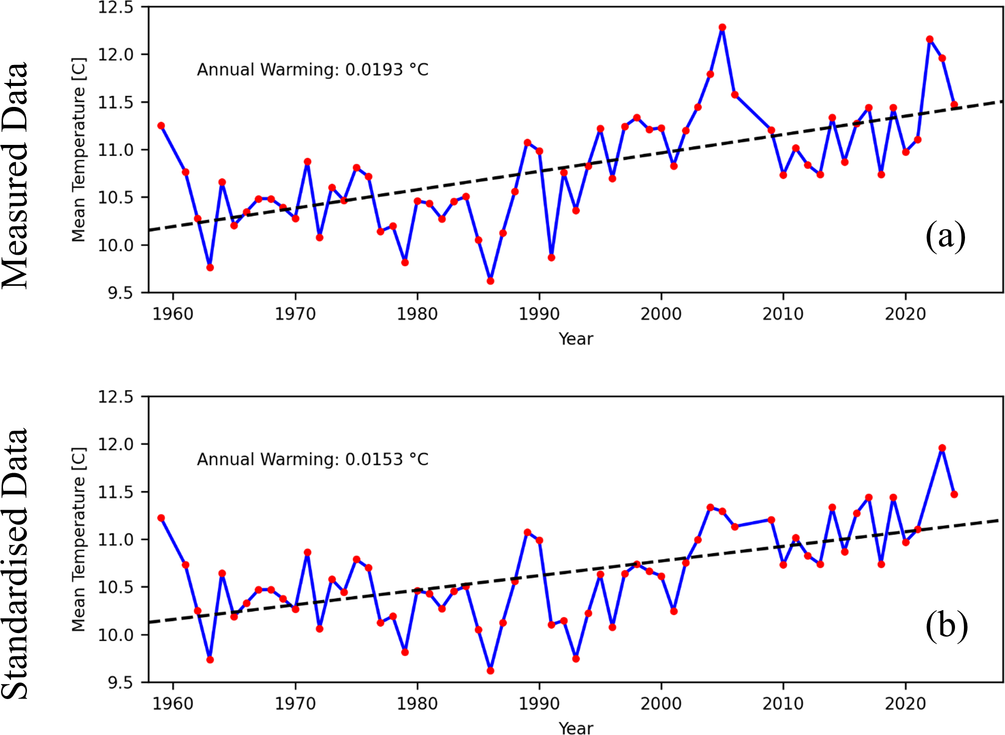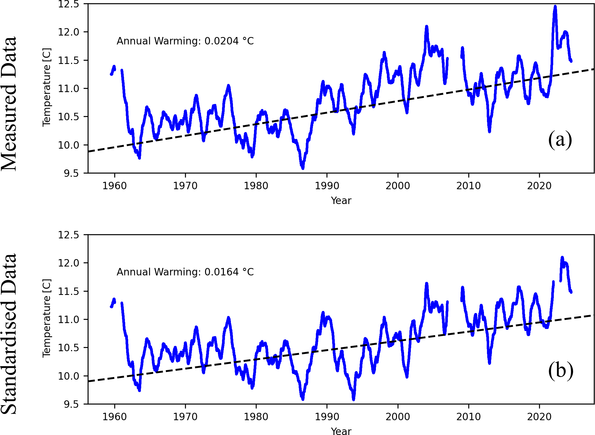 Figure 4Warming trend analysis at Malin Head, based on annual temperatures from both the full-resolution measured data (a) and the standardised data (b).
