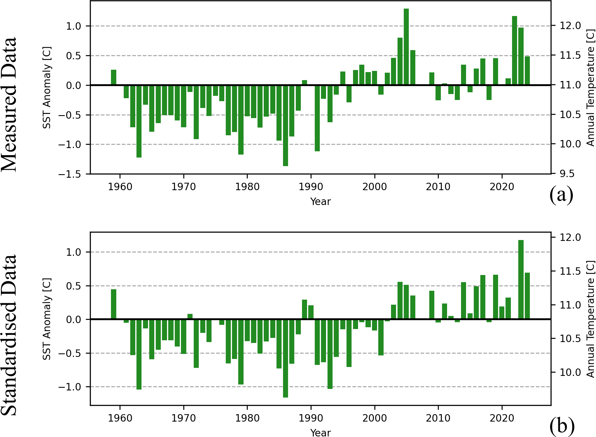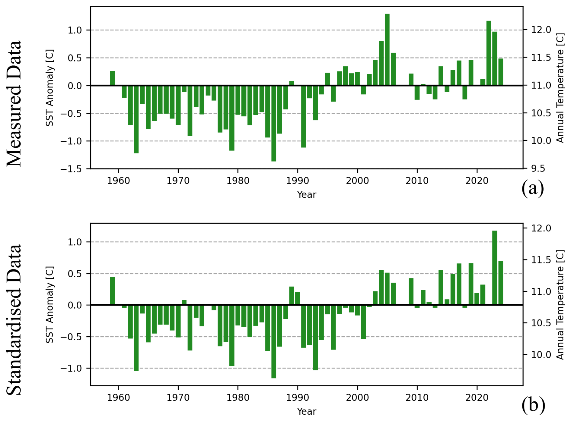 When looking at the patterns found in SST over time it is clear to see that warming has not been a steady or consistent rise from the beginning of the time series. While there is temperature variation from the beginning of the time series, annual average temperatures began to warm significantly in the 1990s through the early 2000s (Fig. 6). The warming undergone during this period accounts for a significant portion of the total warming at Malin Head throughout the length of the time series. When the period 1991 to 2005 is separated and the trend from annual mean values is calculated, the annual warming from the standardised data is approximately 0.085 °C a−1 (R2= 0.694) and the total warming for the period is estimated to 1.19 °C, which is higher than the estimation for the whole period. The same trend can be seen in the measured data with annual warming for this period at 0.107 °C a−1 (R2= 0.690) with a total warming from 1991–2005 of 1.49 °C. Cannaby and Hüsrevoğlu (2009) discussed this excess warming occurring around Ireland in the 1990s, where they analysed that the warming signal for this period could be almost evenly attributed to anthropogenic impacts and natural climate oscillations. They also discussed that the warming signal from anthropogenic sources would continue to grow over time. When annual SST anomalies are visualised based on the 1991–2020 average (Fig. 6), recent warming of the Malin Head site is apparent. For example, in the standardised dataset (Fig. 6b), there is a clear positive trend above the baseline since 2002 which can be contrasted with the previous cooler period. Furthermore, the two most recent years of data, 2023 and 2024, are also the two warmest years on record. The strong warm period is also clearly evident in the measured data (Fig. 6a)