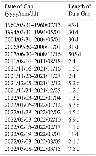Table 1Gaps in SST data within the full-resolution dataset. A time difference is considered a gap if at least a full day of data is missing. Presence of bad data does not constitute a gap.