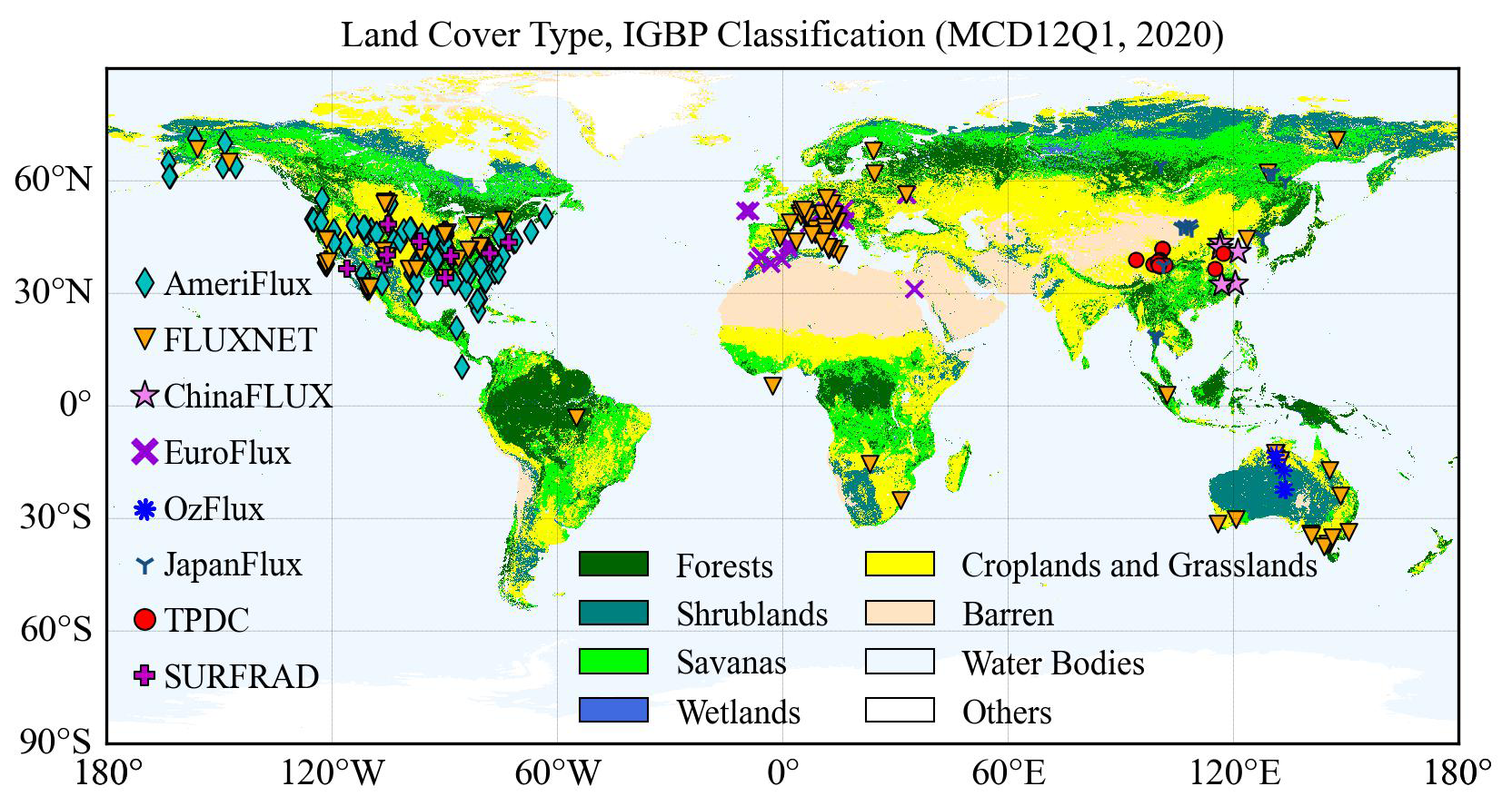These 302 sites used in this study cover a wide range of global climate regimes across 14 land cover types, including (1) evergreen needleleaf forests (ENF, 55 sites); (2) evergreen broadleaf forests (EBF, 12 sites); (3) deciduous needleleaf forests (DNF, 7 sites); (4) deciduous broadleaf forests (DBF, 40 sites); (5) mixed forests (MF, 8 sites); (6) closed shrublands (CSH, 5 sites); (7) open shrublands (OSH, 11 sites); (8) woody savannas (WSA, 6 sites); (9) savannas (SAV, 10 sites); (10) grasslands (GRA, 62 sites); (11) permanent wetlands (WET, 22 sites); (12) croplands (CRO, 59 sites); (13) water bodies (WAT, 1 sites); (14) cropland/natural vegetation mosaics (CVM, 4 sites). Among them, 44 sites (∼15 % of the total, see Table S1 in the Supplement) were isolated to serve as spatially independent sites to test the generated datasets and they did not participate in the development of the model/datasets.