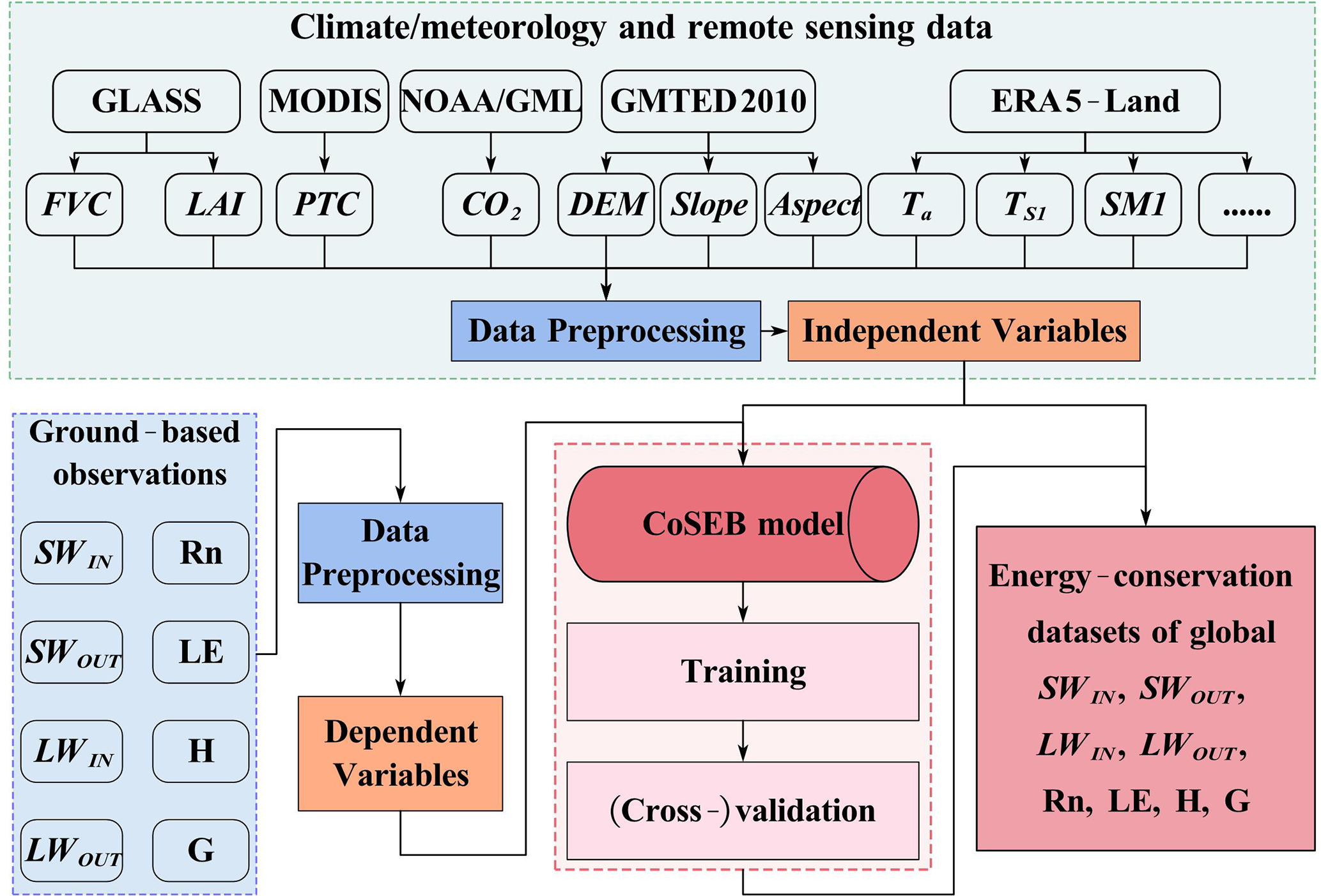 This study for the first time developed data-driven energy-conservation datasets of global land surface radiation and heat fluxes using our CoSEB model renewed based on GLASS and MODIS products, ERA5-Land reanalysis datasets, topographic data, CO2 concentration data, and observations at 258 EC sites worldwide.
