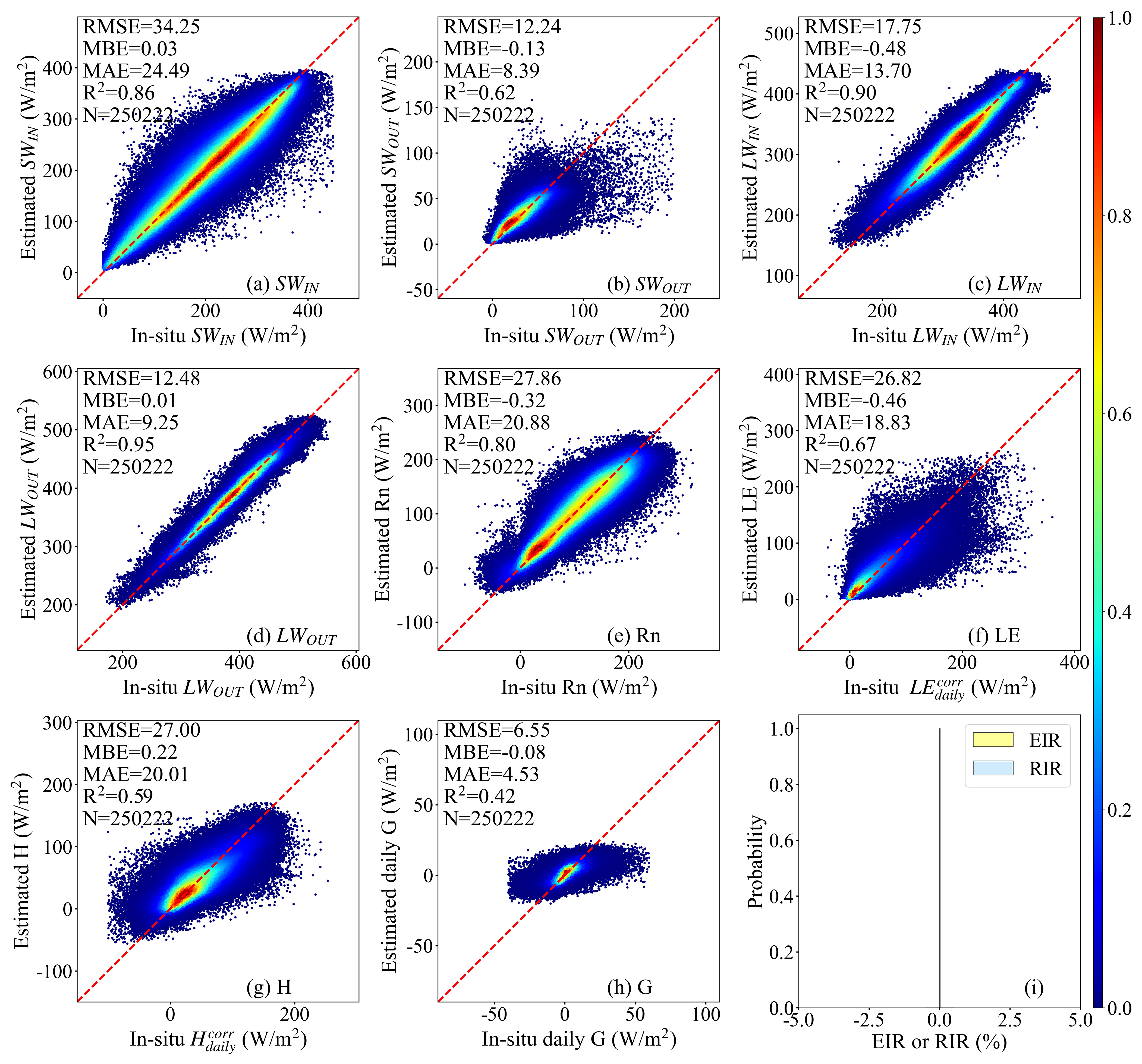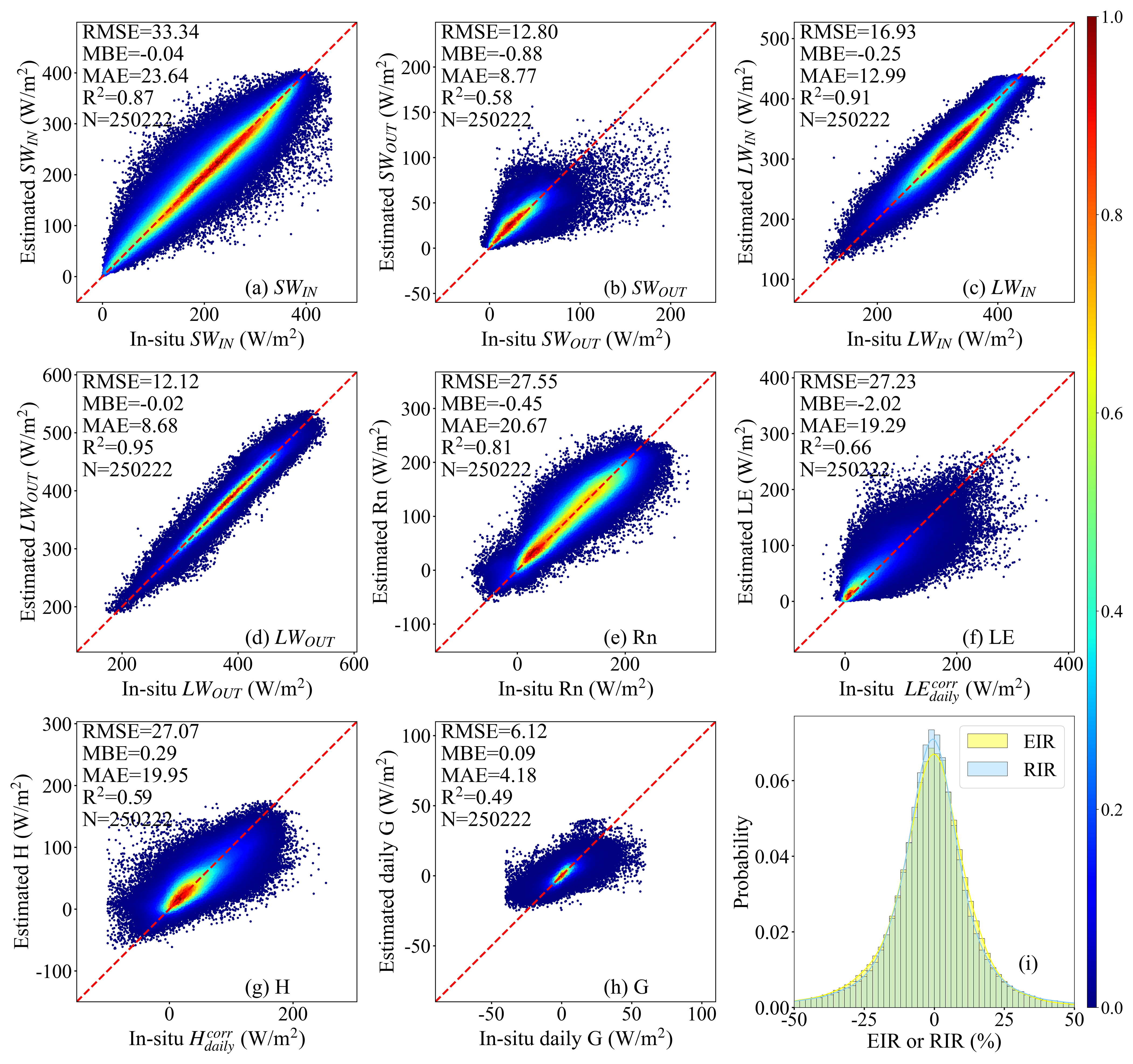 Figure 3Scatter density plots of the site-based 10-fold cross-validation of daily downward shortwave and longwave radiation (SWIN and LWIN), upward shortwave and longwave radiation (SWOUT and LWOUT), net radiation (Rn), soil heat flux (G), latent heat flux (LE) and sensible heat flux (H) derived by the CoSEB model against in situ observed SWIN, LWIN, SWOUT, LWOUT, Rn, G, and energy imbalance-corrected LE () and H (). The EIR and RIR in the subfigure (i) represent the energy imbalance ratio and radiation imbalance ratio, which are defined as and , respectively. The colorbar represents the normalized density of data points.