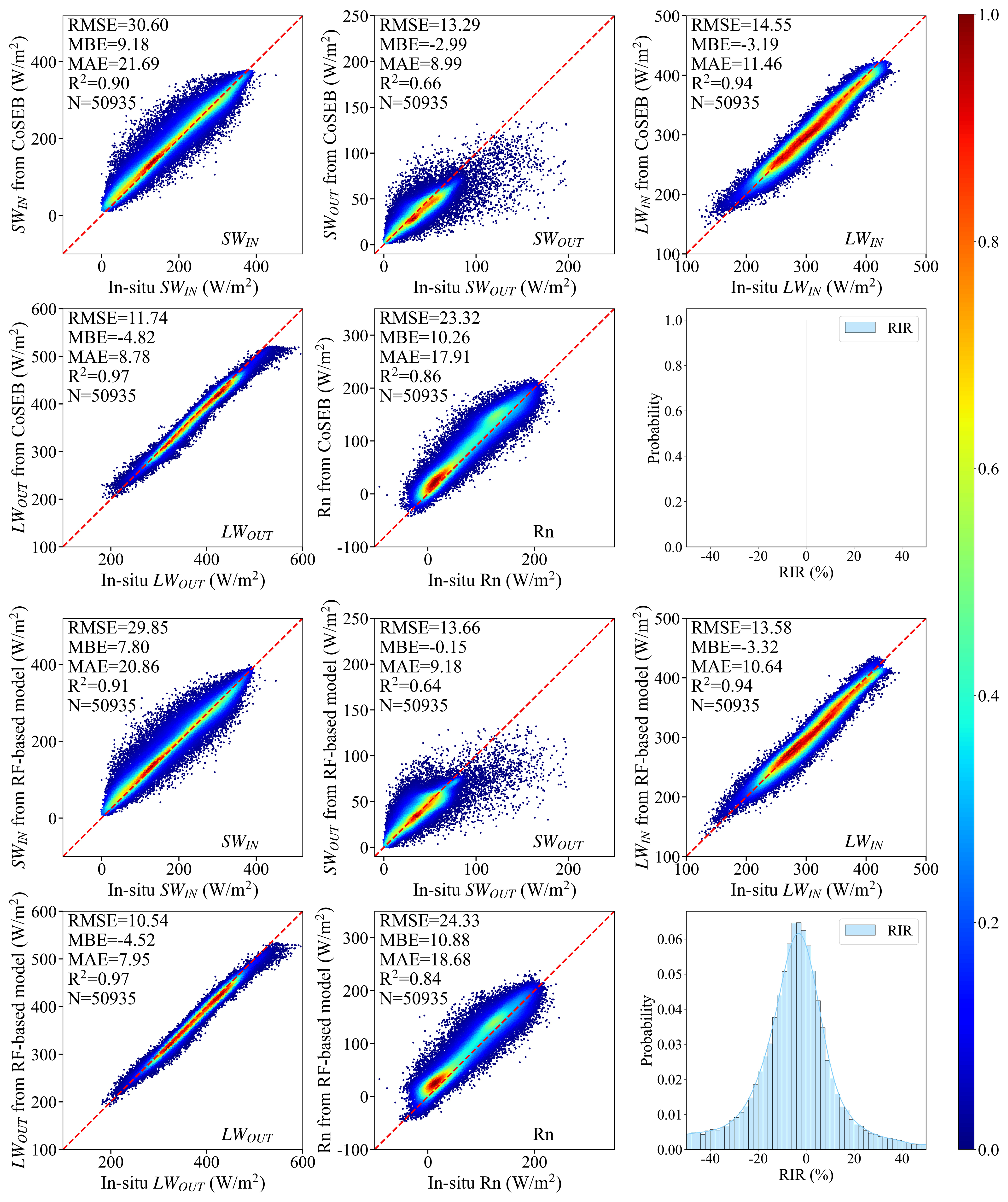 Figure 5Scatter density plots of the validation of daily downward shortwave and longwave radiation (SWIN and LWIN), upward shortwave and longwave radiation (SWOUT and LWOUT) and net radiation (Rn) from the renewed CoSEB model (upper two rows) and RF-based uncoordinated models (lower two rows) against in situ observations at nine radiation sites from SURFRAD. The RIR represents the radiation imbalance ratio, defined as . The colorbar represents the normalized density of data points.