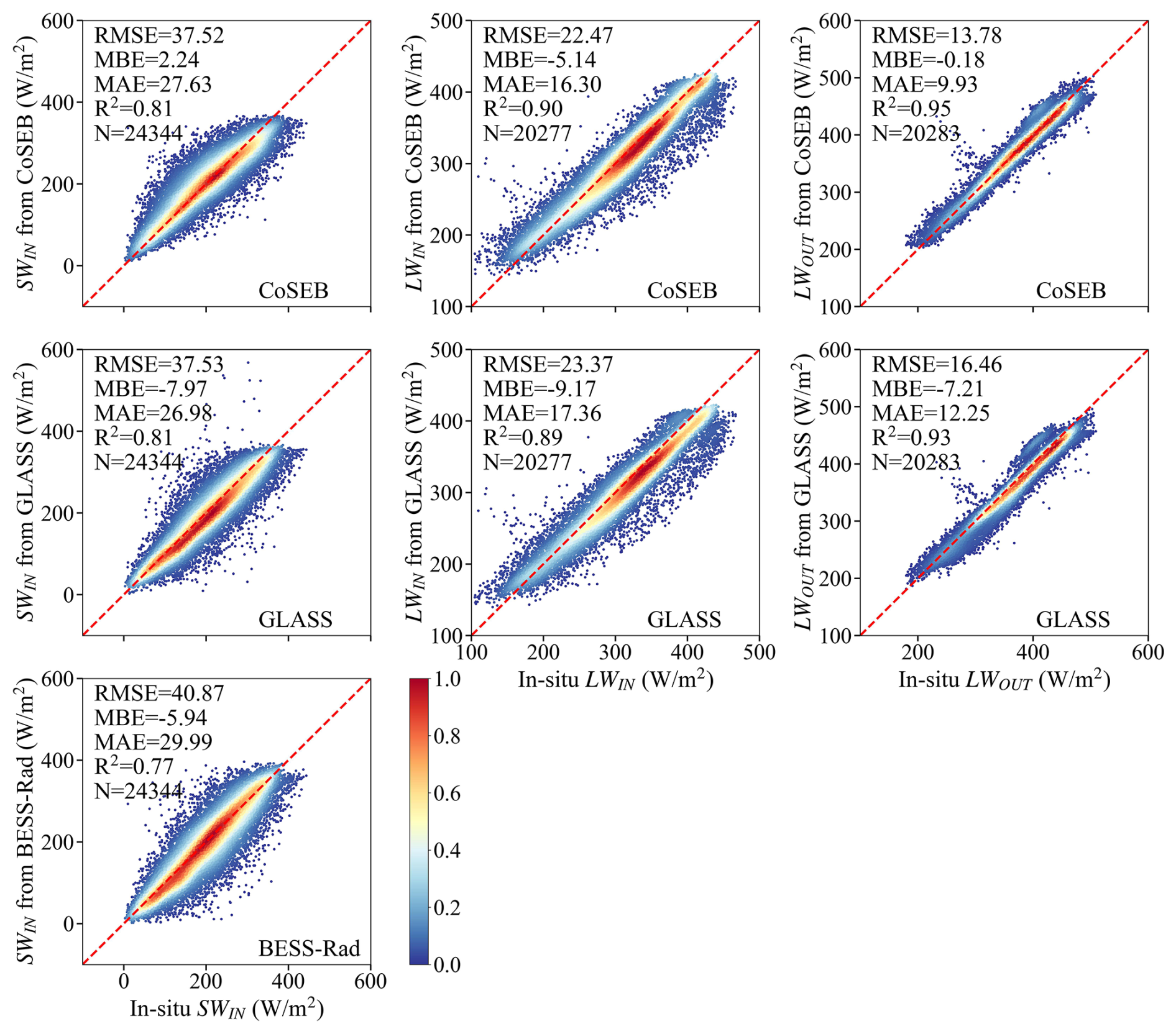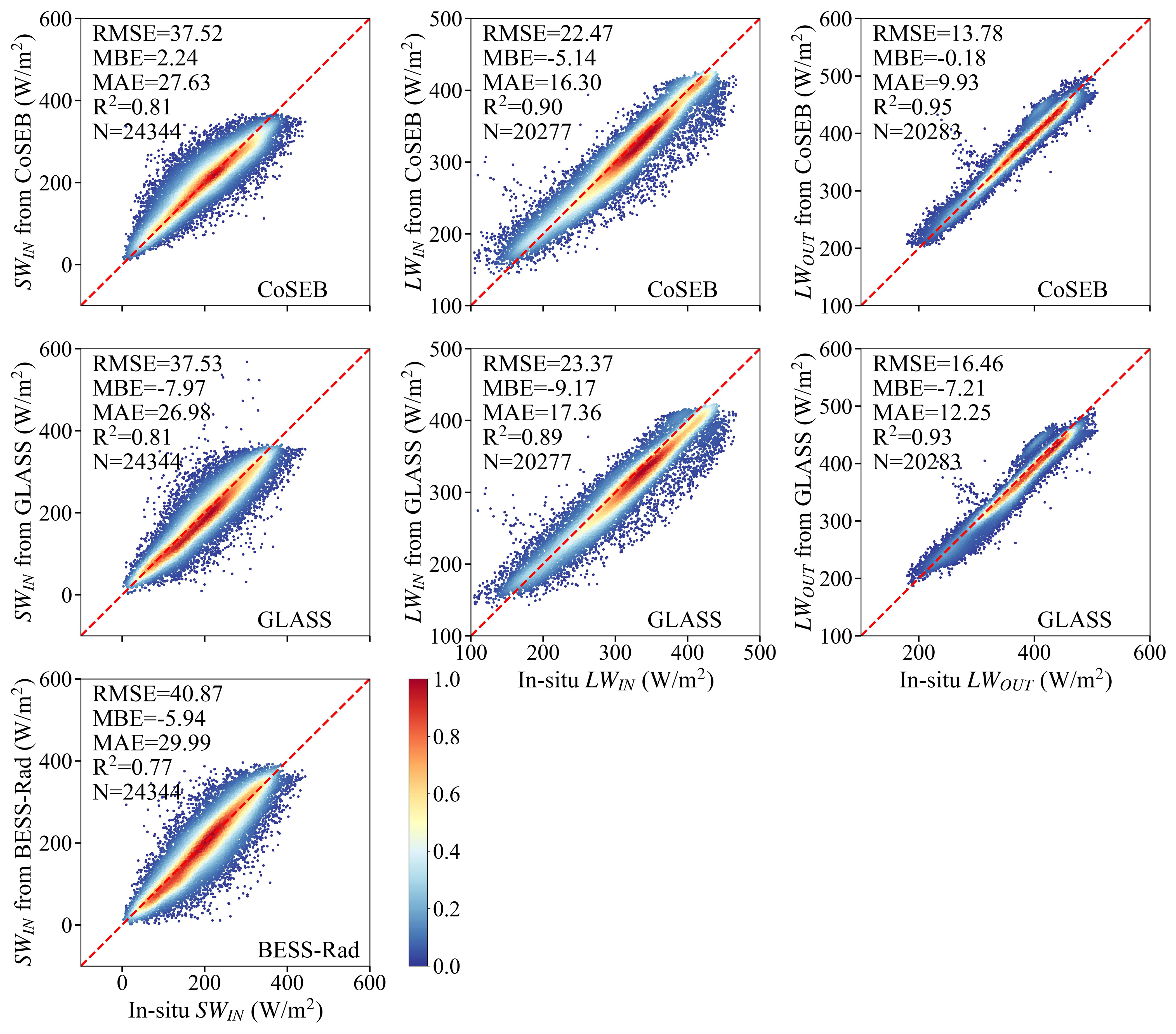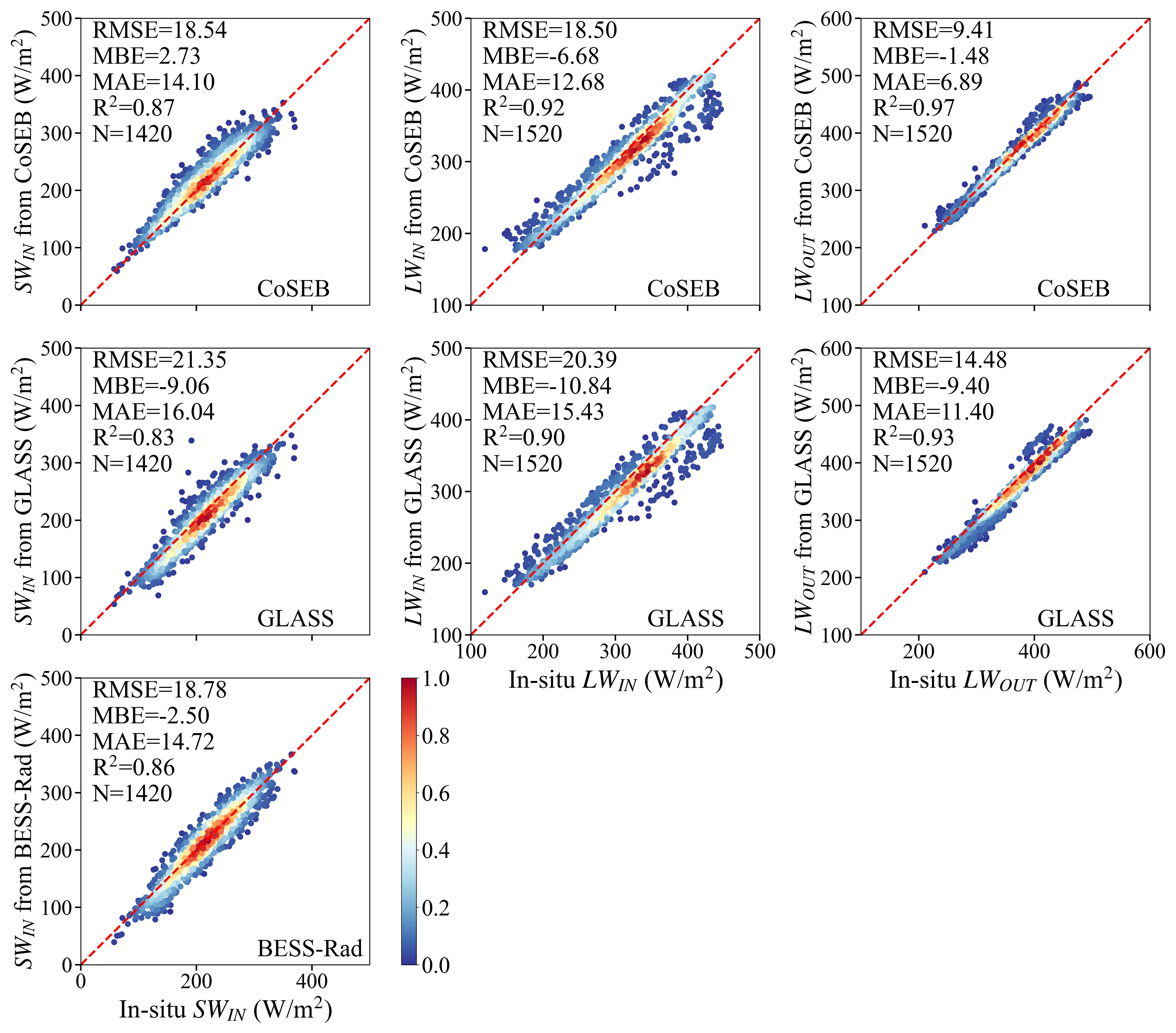 Figure 6Comparison of the daily downward shortwave radiation (SWIN, the first column), downward longwave radiation (LWIN, the second column) and upward longwave radiation (LWOUT, the third column) from the CoSEB-based datasets, GLASS and BESS-Rad with the in situ observed SWIN, LWIN and LWOUT at 44 test sites. The colorbar represents the normalized density of data points.