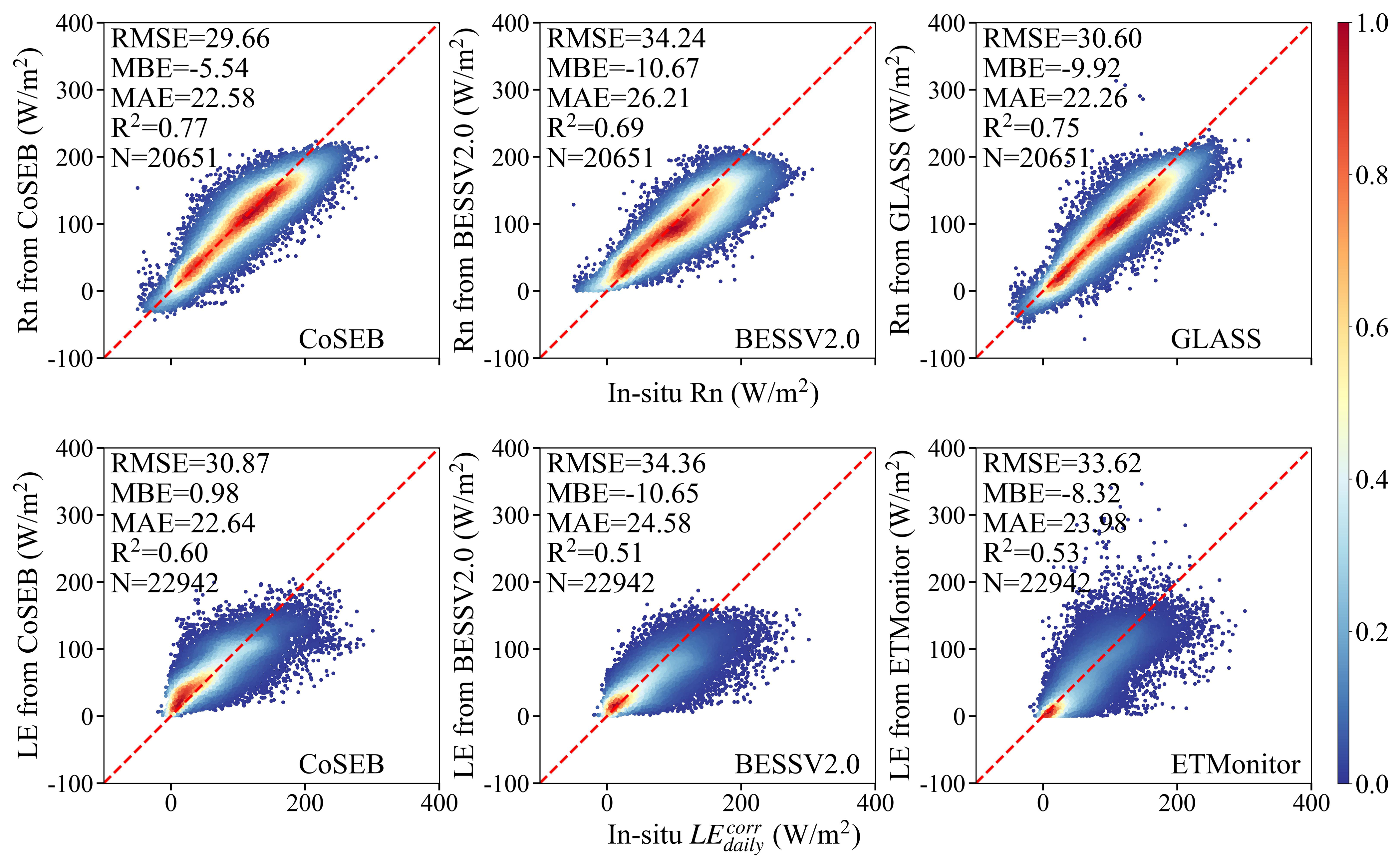 Figure 7Comparison of the daily net radiation (Rn, the upper row) and latent heat flux (LE, the lower row) from the CoSEB-based datasets, BESSV2.0, GLASS and ETMonitor with the in situ observed Rn, and energy imbalance-corrected LE () at 44 test sites. The colorbar represents the normalized density of data points.