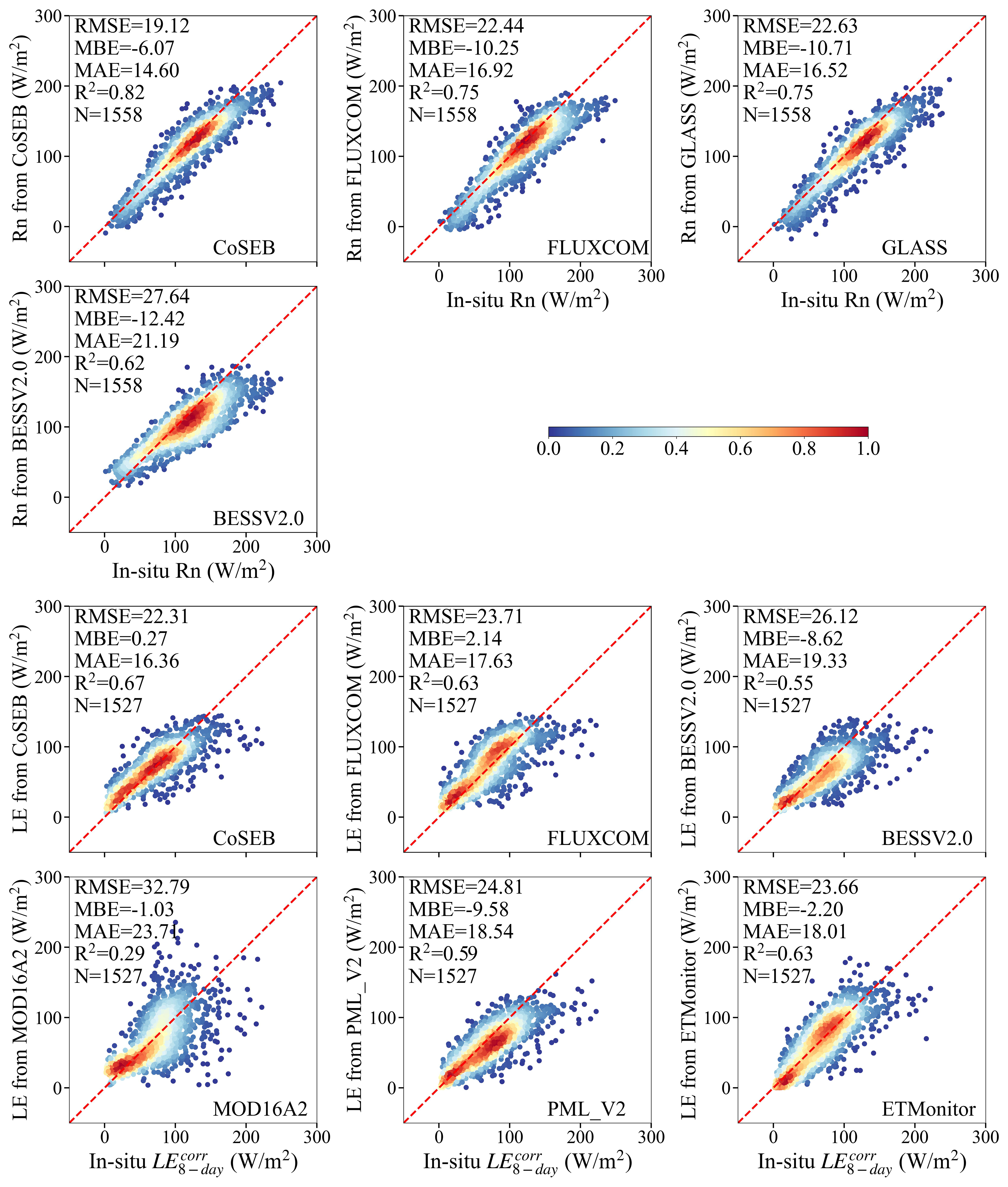 Figure 9Comparison of the 8 d net radiation (Rn, the upper two rows) and latent heat flux (LE, the lower three rows) from the CoSEB-based datasets, FLUXCOM, BESSV2.0, GLASS, MOD16A2, PML_V2 and ETMonitor with in situ observed Rn, and energy imbalance-corrected LE () at 44 test sites. The colorbar represents the normalized density of data points.