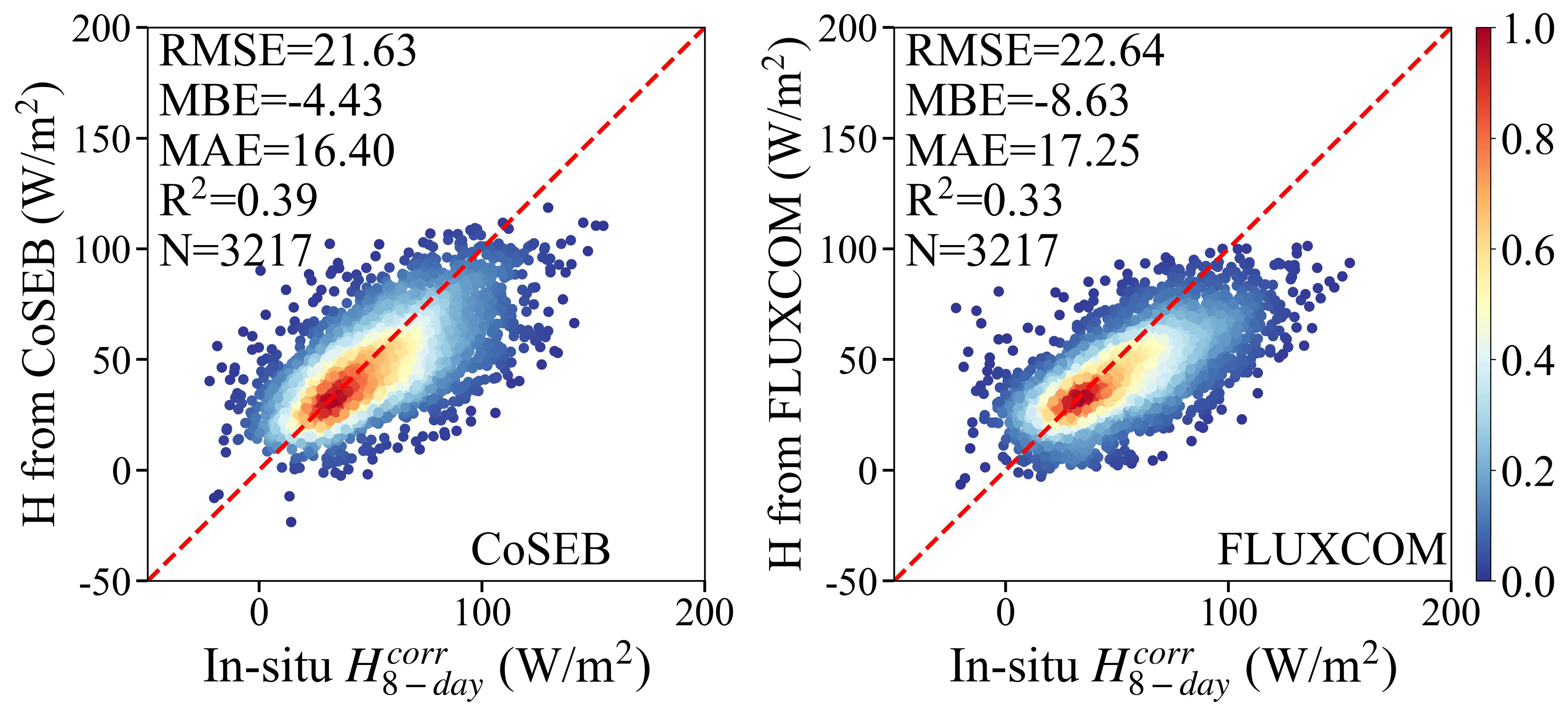 Figure 10Comparison of the 8 d sensible heat flux (H) from the CoSEB-based datasets and the FLUXCOM with the in situ energy imbalance-corrected H () at 44 test sites. The colorbar represents the normalized density of data points.