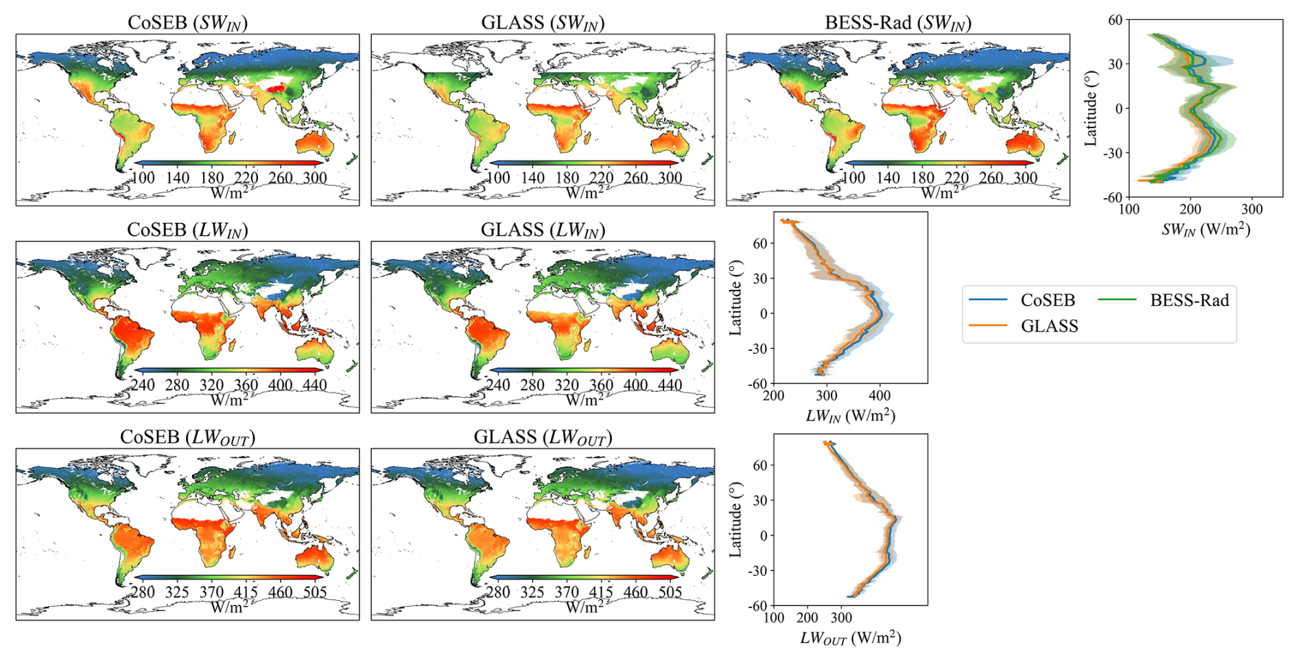 Figure 11Spatial patterns of global mean annual downward shortwave radiation (SWIN, the first row), downward longwave radiation (LWIN, the second row) and upward longwave radiation (LWOUT, the third row) from 2001 to 2018 by CoSEB-based datasets, GLASS and BESS-Rad. The rightmost subfigure of each row represents the latitudinal profiles of mean annual SWIN, LWIN and LWOUT from CoSEB-based datasets, GLASS and BESS-Rad, where the shaded area represents the variation of standard deviation for each product.