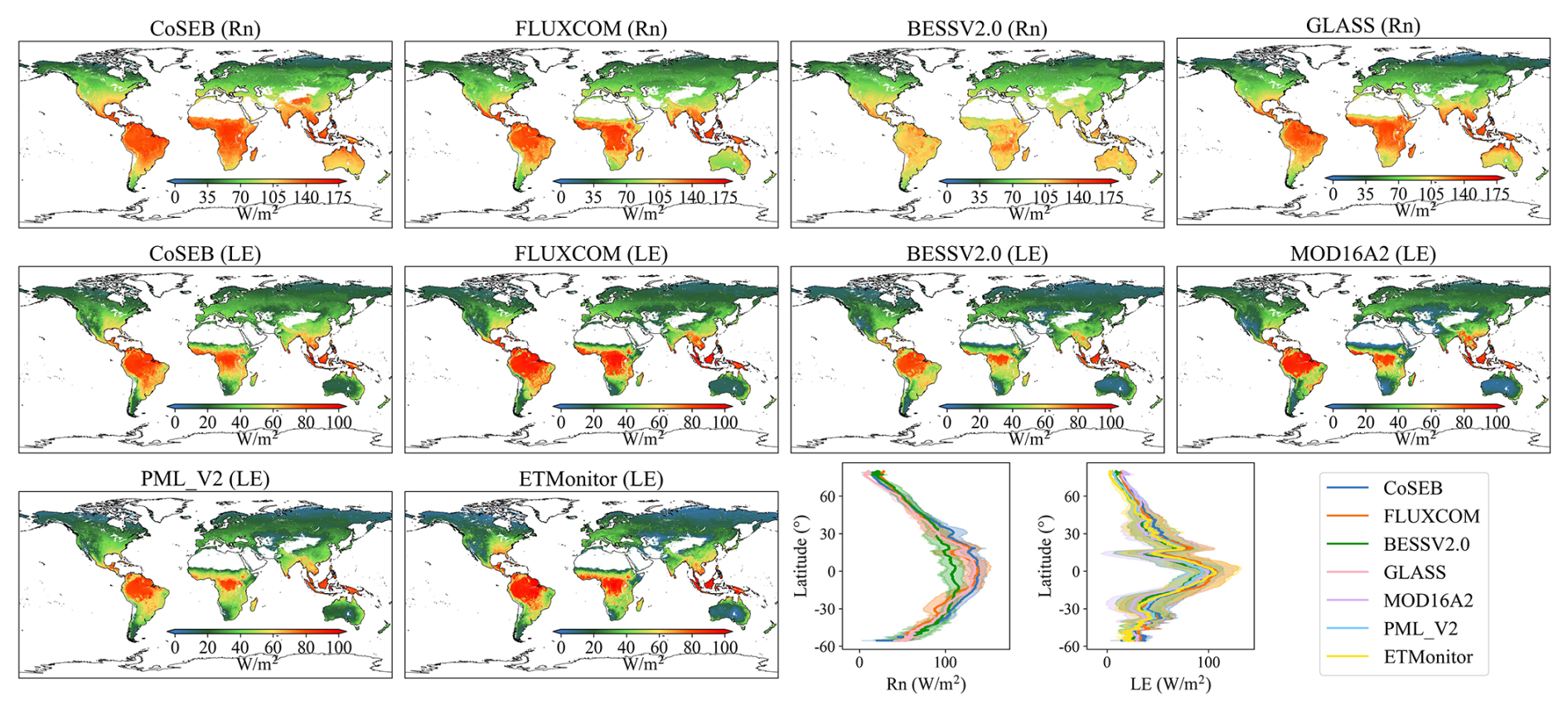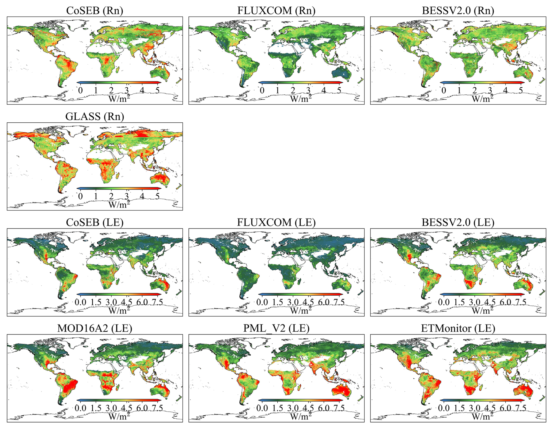 In addition to the validation and inter-comparison of the CoSEB-based datasets at the site scale, we further inter-compared the estimates of land surface radiation and heat fluxes from the CoSEB-based datasets and the mainstream products/datasets, in terms of their global spatial and temporal patterns.