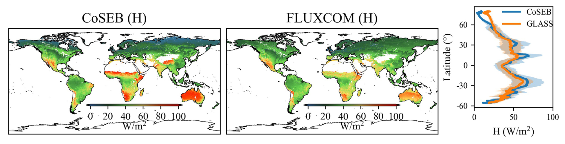 Figure 13Spatial patterns of global mean annual sensible heat flux (H) from 2001 to 2018 by CoSEB-based datasets and FLUXCOM. The rightmost subfigure represents the latitudinal profiles of mean annual H from CoSEB-based datasets and FLUXCOM, where the shaded area represents the variation of standard deviation for each product.