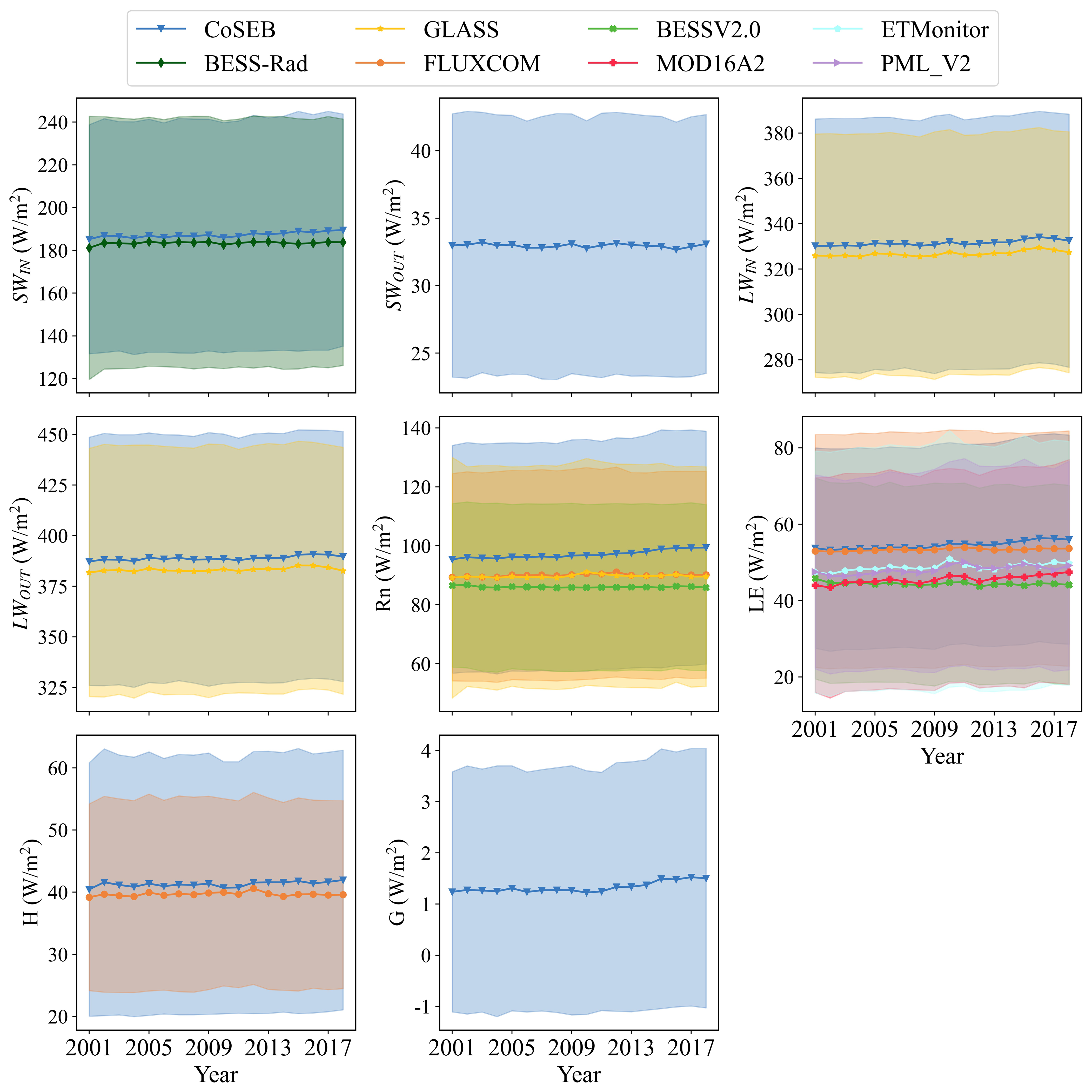 Figure 14Temporal variation of annual mean downward shortwave radiation (SWIN), upward shortwave radiation (SWOUT), downward longwave radiation (LWIN), upward longwave radiation (LWOUT), net radiation (Rn), latent heat flux (LE), sensible heat flux (H) and soil heat flux (G) from 2001 to 2018 from the CoSEB-based datasets, BESS-Rad, GLASS, FLUXCOM, BESSV2.0, PML_V2, MOD16A2 and ETMonitor. The shaded area represents the variation of the standard deviation for each product.