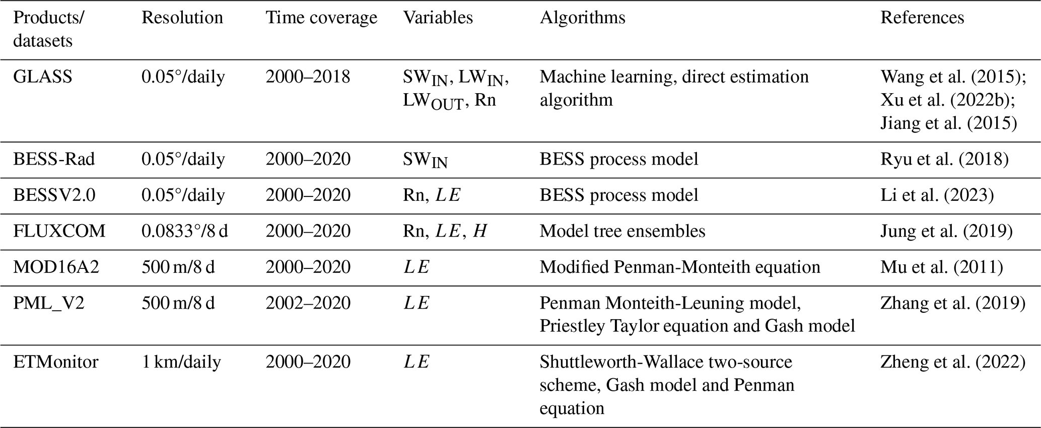 The GLASS SWIN products are derived from a combination of the GLASS broadband albedo product and the surface shortwave net radiation estimates, where the surface shortwave net radiation is estimated using linear regression with MODIS top-of-atmosphere (TOA) spectral reflectance (Wang et al., 2015). The GLASS LWIN and LWOUT products are generated using densely connected convolutional neural networks, incorporating Advanced Very High-Resolution Radiometer (AVHRR) TOA reflectance and ERA5 near-surface meteorological data (Xu et al., 2022b). The GLASS Rn products are estimated from the meteorological variables from MERRA2 and surface variables from GLASS using the multivariate adaptive regression splines model (Jiang et al., 2015). The BESS-Rad and BESSV2.0 estimate SWIN and Rn using a radiative transfer model (i.e., Forest Light Environmental Simulator, FLiES) with an artificial neural network based on MODIS and MERRA2 reanalysis datasets, and using FLiES based on MODIS products and NCEP/NCAR reanalysis data, respectively (Li et al., 2023; Ryu et al., 2018). Moreover, the BESSV2.0 (Li et al., 2023), MOD16A2 (Mu et al., 2011), PML_V2 (Zhang et al., 2019) and ETMonitor (Zheng et al., 2022) generated global LE by physical models, such as Penman-Monteith equation, Priestley-Taylor equation and/or Shuttleworth-Wallace two-source scheme. The FLUXCOM Rn, LE and H datasets are obtained through multiple machine learning methods based on in situ observations from FLUXNET and remote sensing and meteorological data (Jung et al., 2019). For better consistency, RF-based 8 d 0.0833° Rn and Bowen ratio-corrected LE and H for the periods of 2000 to 2020 from the FLUXCOM were used in this study.