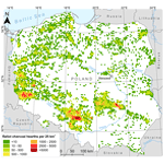 Figure 2Map of the spatial density of Relict Charcoal Hearths (RCHs) across forested areas of Poland.
