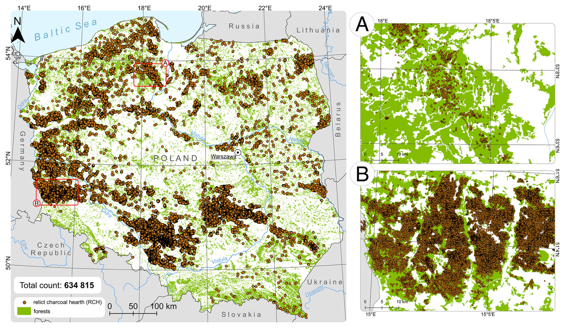 Figure 1Location of the study area within Poland with all identified Relict Charcoal Hearths (RCHs). The figure includes forest cover based on CORINE Land Cover 2018 (European Environmental Agency). Panels (a) and (b) present contrasting densities of RCH distribution across forested regions of Poland.