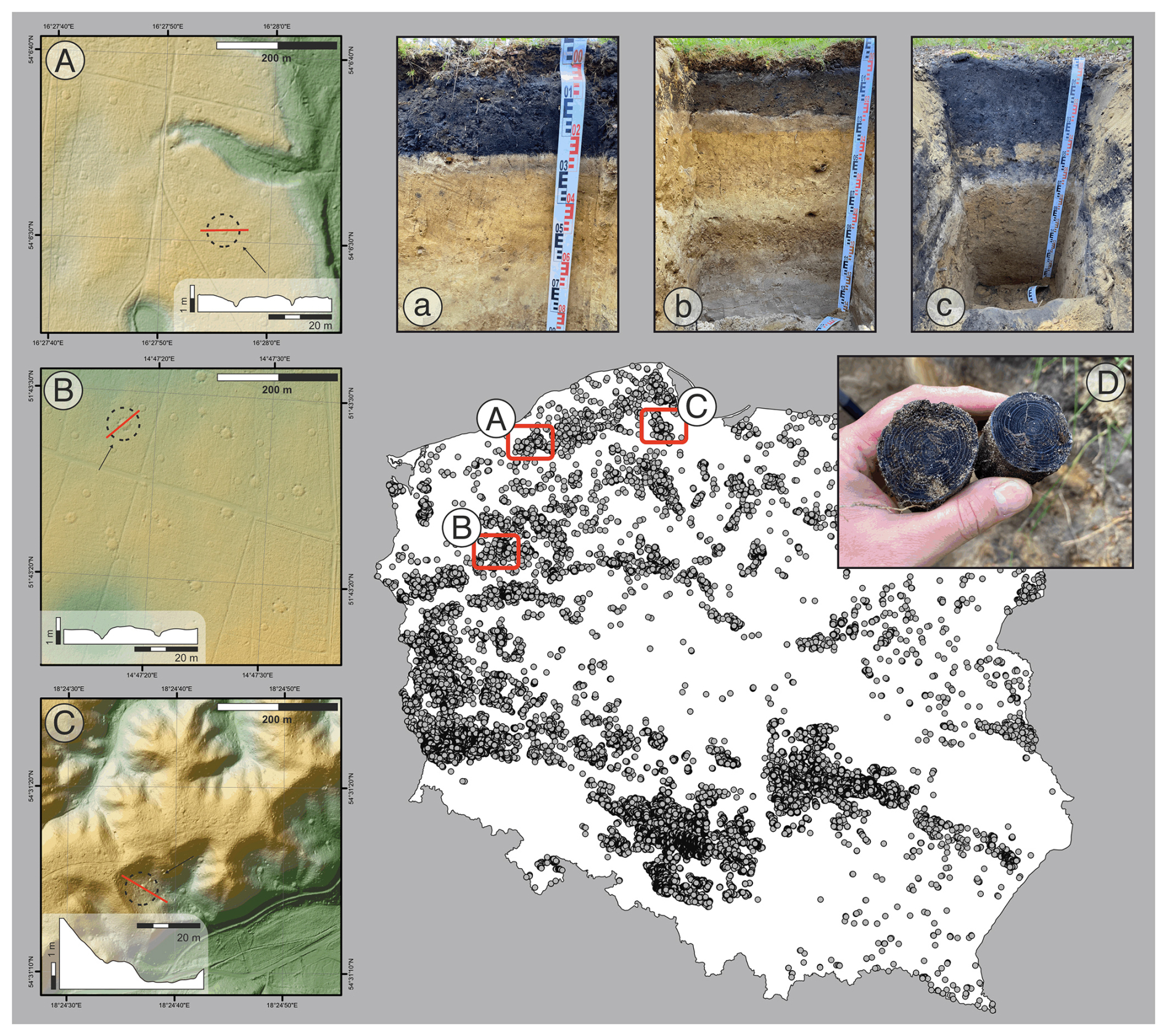 Figure 3Map of Poland with all identified Relict Charcoal Hearths (RCHs) with a schematic cross-section of three typical hearth configurations: (A) hearth located on flat terrain with visible hollows used for tar collection, (B) hearth built on a gentle slope without tar-extraction features, and (C) hearth situated on a steep incline, reflecting adaptation to challenging topographic conditions. Soil profiles (a–c) correspond to field-recorded sections for each hearth type. Picture (D) shows macroscopic charcoal fragments preserved in the soil profile.