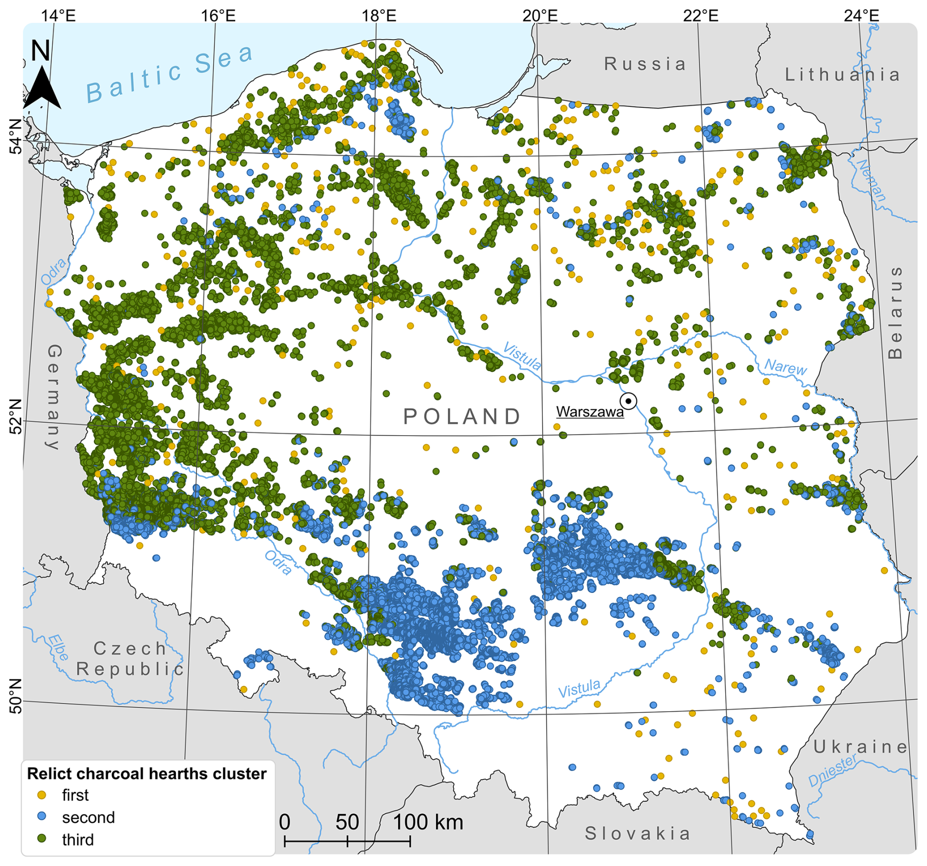 Figure 4Spatial distribution of three identified types of Relict Charcoal Hearths (RCHs) across Poland.