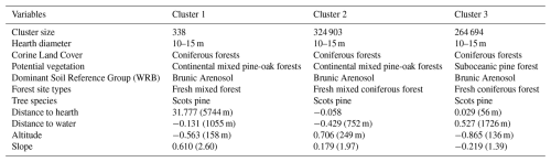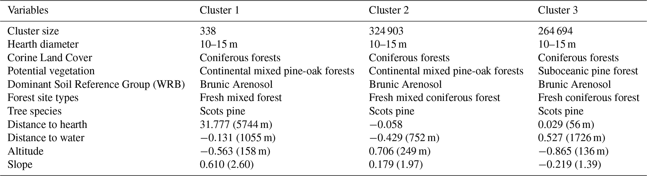 Cluster characteristics are based on modes as well as the highest and lowest z-scores. Cluster 1 contains medium-sized hearths located in pine forests, close to other hearths, far from rivers and lakes, on gentle slopes and at low altitudes. Cluster 2 contains medium-sized hearths found in mixed forests, isolated from other hearths, and on steep slopes. Cluster 3 contains medium-sized hearths located in pine forests, in close proximity to other hearths, and at high altitudes on steeper slopes.