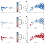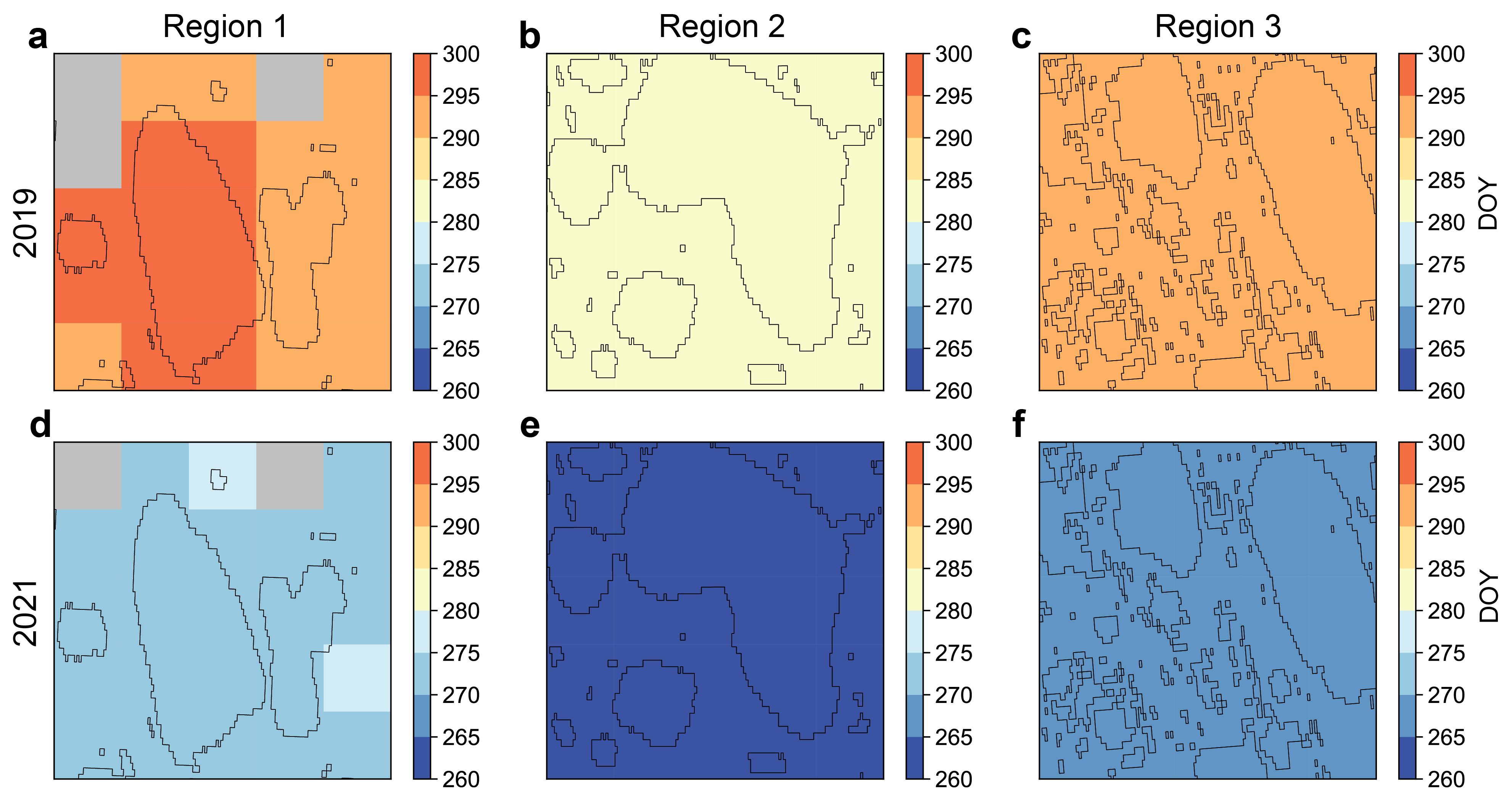 Figure 8The lake ice freeze-up dates in 2021 (d–f) were earlier than those in 2019 (a–c) across the three selected regions in the ACP (Fig. 1). Each subplot shows a 5 km×5 km area with water bodies delineated by black lines. The phenology dates are calculated based on 1 km S1 ice fraction data, and the color of each 1 km grid cell indicates the freeze-up date in day of year (DOY).