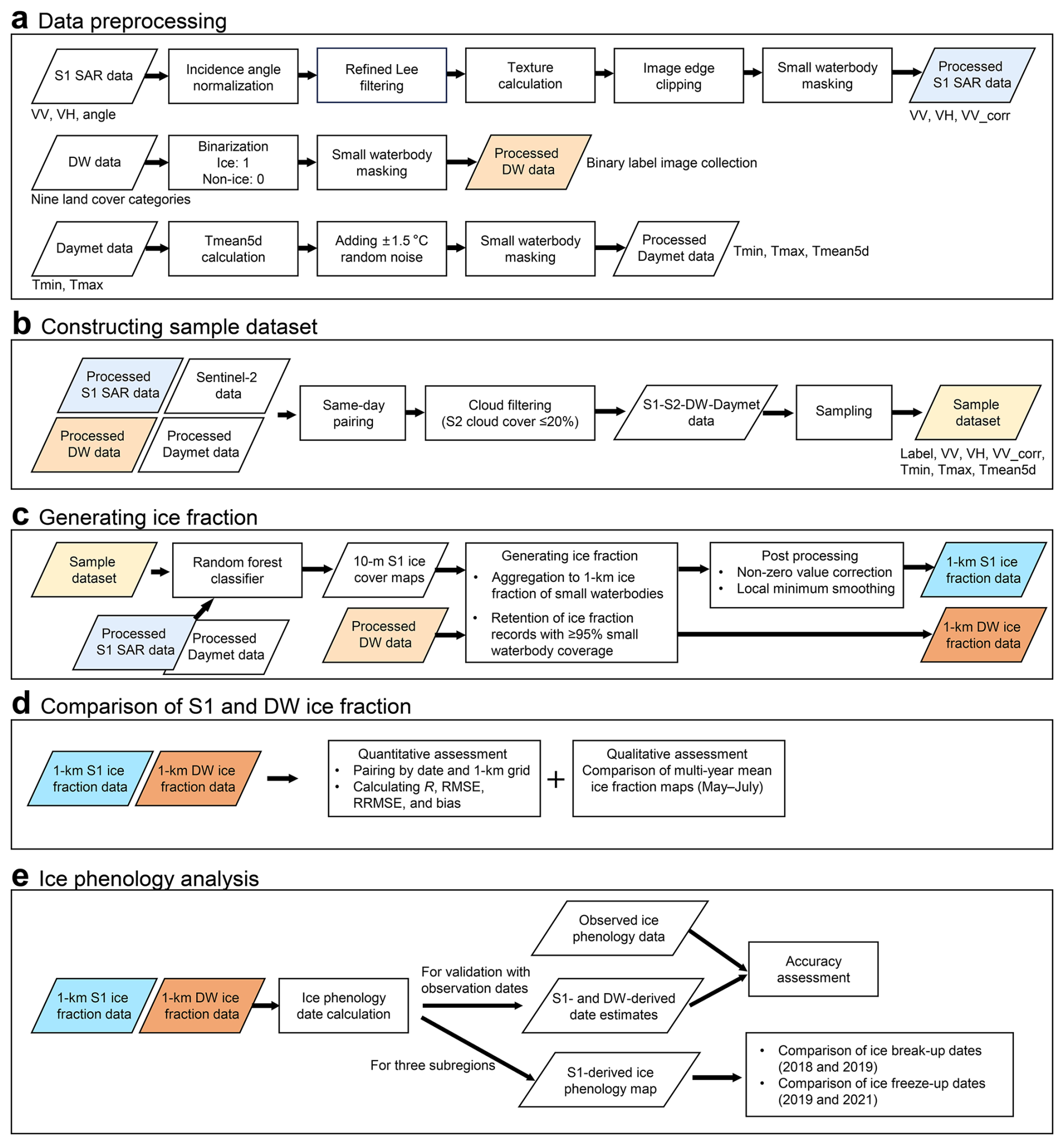 Figure 2Workflow for generating ice fraction dataset, comparing S1 and DW ice fraction, and analyzing ice phenology.